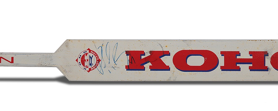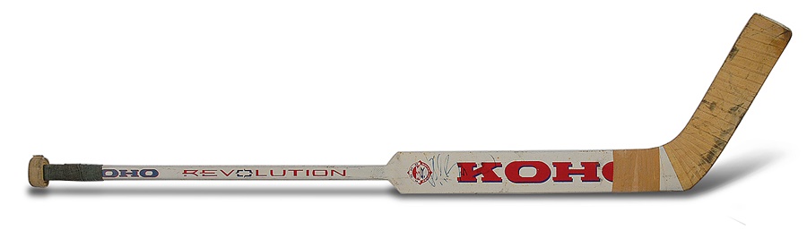 Before his record was broken by Martin Brodeur, Patrick Roy held the NHL's all-time record for victories. This Koho Revolution stick, used by one of the best goalies ever to play the game, has "P. ROY" stamped on shaft. The knob end and paddle have the original tape on them, with puck marks visible on the blade. Signed in 6/10 blue felt tip pen. No cracks. Also has the date stamp of "4 Mars 1994" (March 4, in French) on the shaft. Very nice use.
