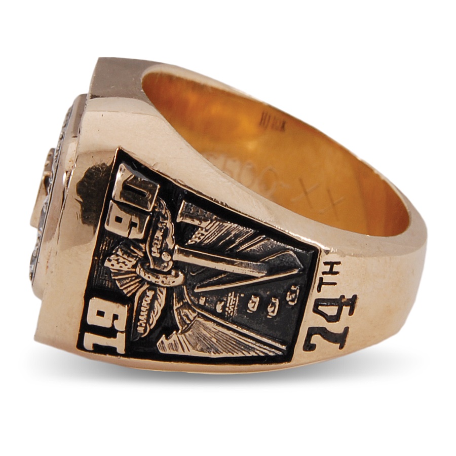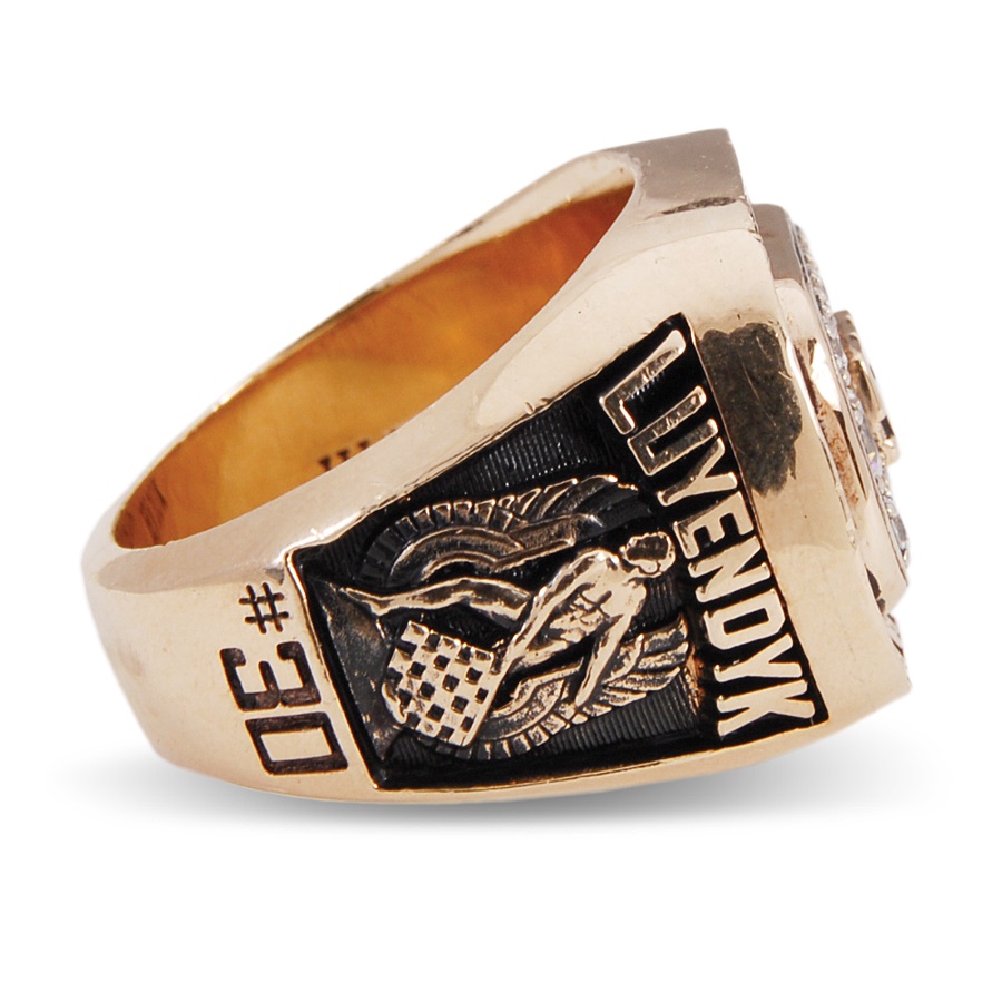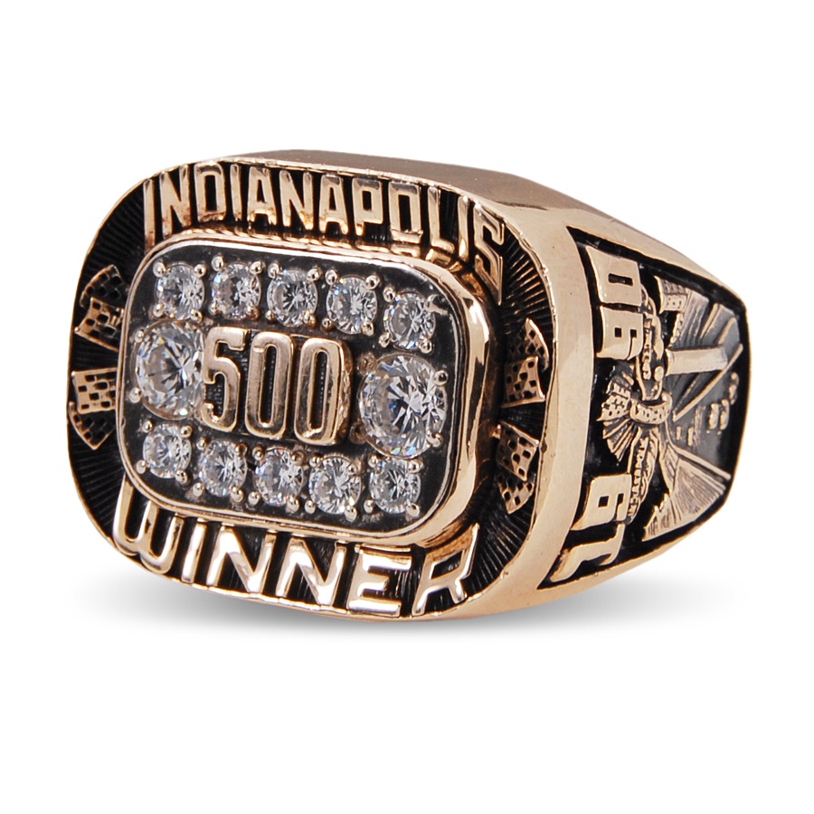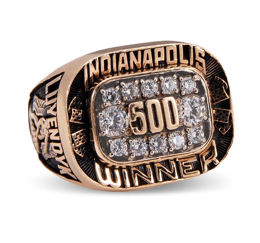 This is a salesman's sample ring that is nearly identical to the one that the winner received. In fact, the only difference is that this one has cubic zirconias instead of diamonds. The face showcases the number 500 in gold, surrounded by 12 cz's. It is 10-karat gold and stamped H J (Herff-Jones) inside along with "10K." Atop the face is "INDIANAPOLIS" and "WINNER" is below, with checkered flags on either side. The left shank lists the recipient's name (LUYENDYK) and his number (30) surrounding the depiction of a flagsman. The opposite shank reads: 1990 and "24th" with the Indy 500 logo and speedway illustration. It is in NRMT condition and sized 10 3/4. Dutch racer Ari Luyendyk won the first of his two Indy 500 races in 1990.