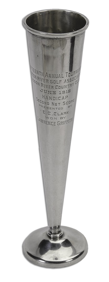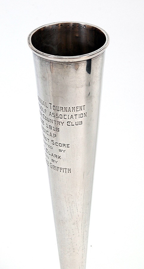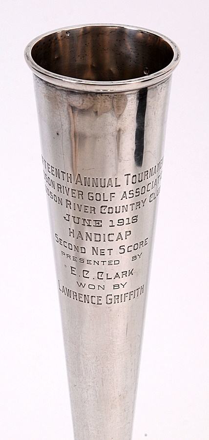 This stately trophy stands 13 inches tall and is inscribed: Fifteenth Annual Tournament Hudson River Golf Association Hudson River Country Club June 1916 Handicap Second Net Score Presented by E C Clark Won by Lawrence Griffith. The vase portion leans slightly and has a couple of minor dings but otherwise is in nice shape.