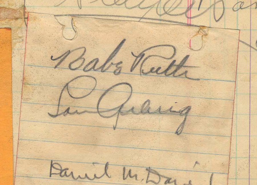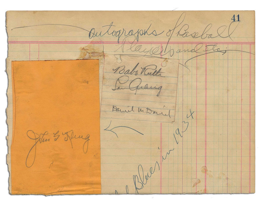 This lot contains a very nice representation of Babe Ruth and Lou Gehrig signatures. The best part about these two autographs is that they are together on the same slip of paper, which is a very rare occurrence. The slip that the autographs are on is glued to another sheet of paper containing various other writings and an unknown signature below Gehrig. An album page with Johnny Kling's signature (rare) is also affixed to the paper. Both the Ruth and Gehrig signatures are in pencil and were signed circa 1933. The Ruth grades 8/10 while the Gehrig rates 7/10. The Gehrig signature has some light shadowing which either means that the pencil that was used had a irregular point or that someone tried to enhance potions of the signature; we are not certain which of the two occurred. The Ruth is untouched. Comes with LOA.