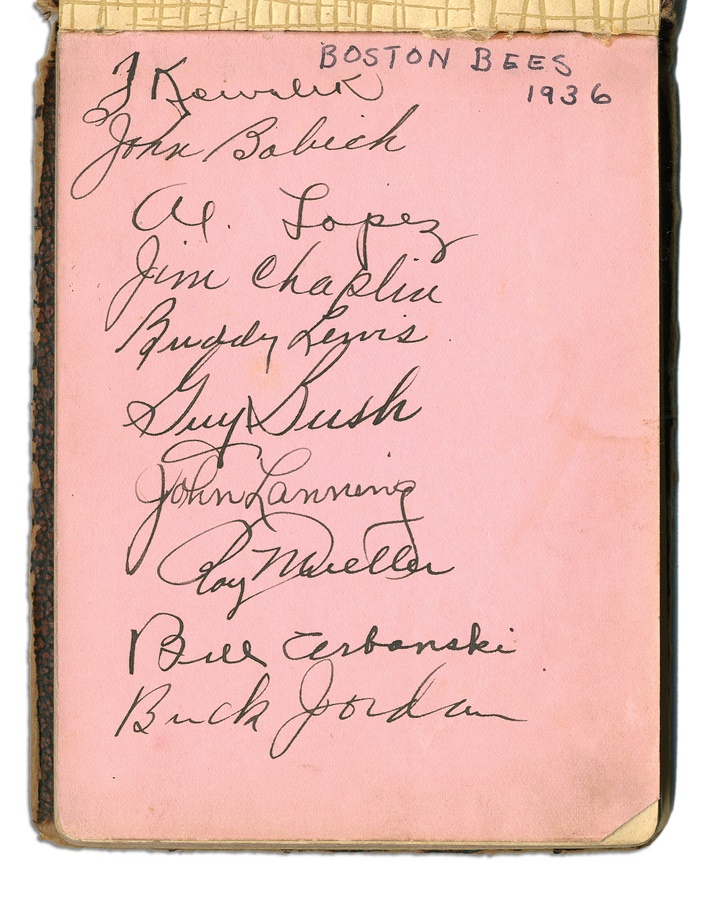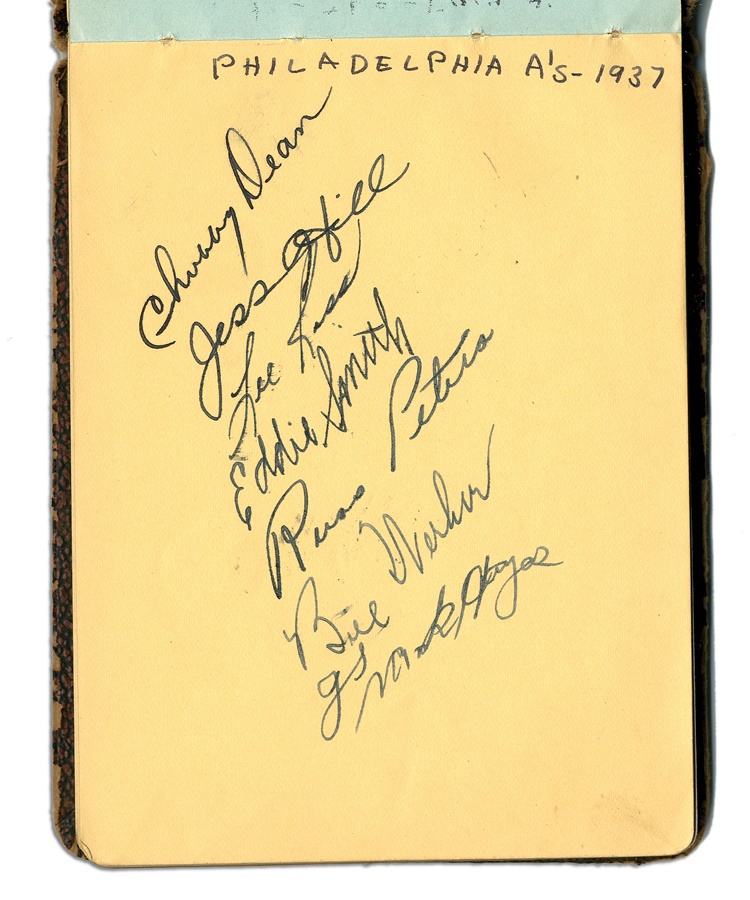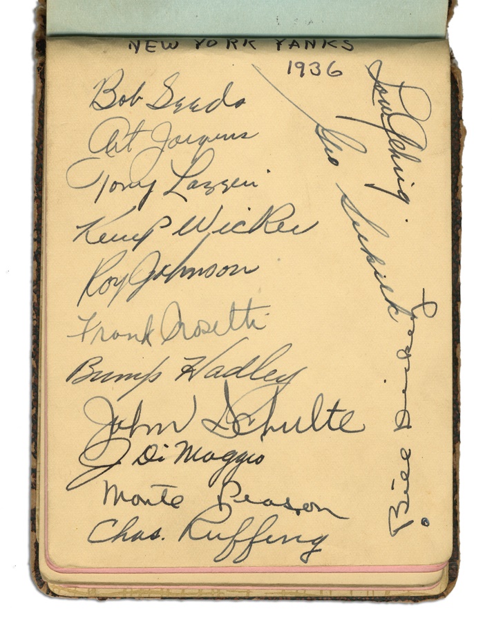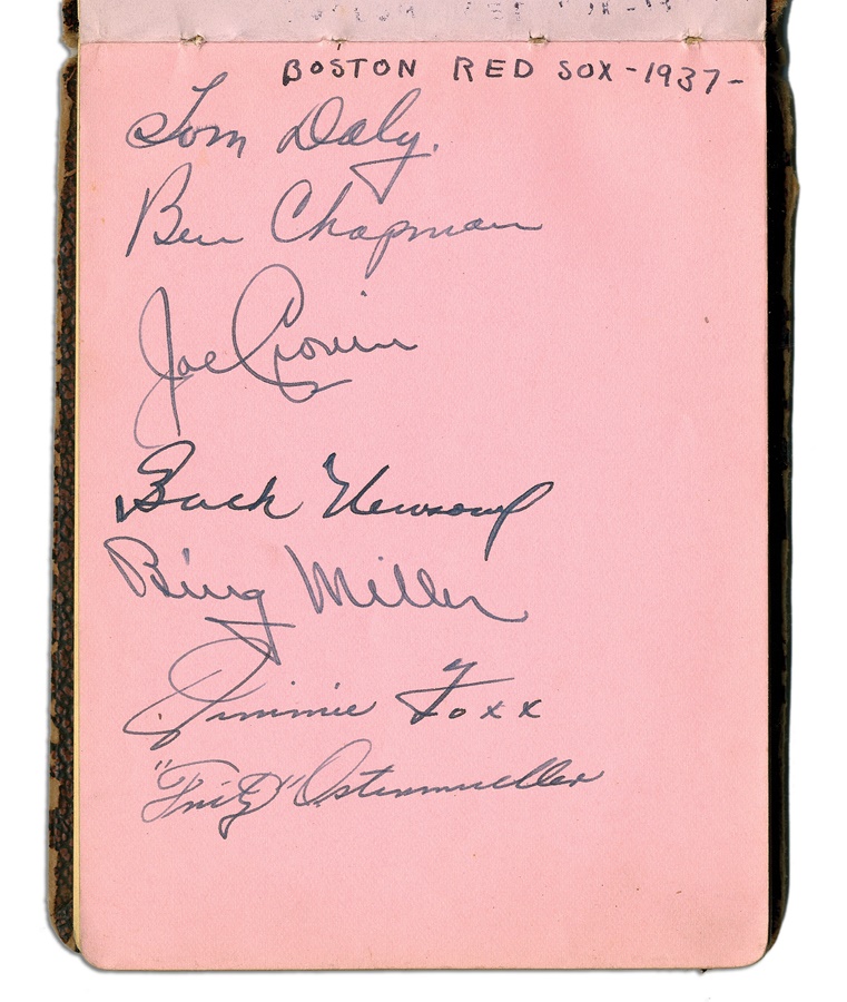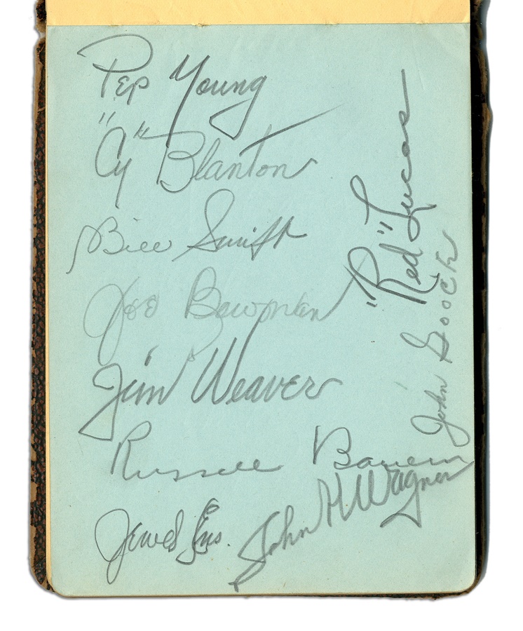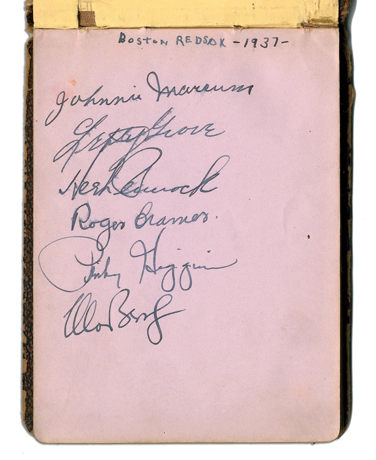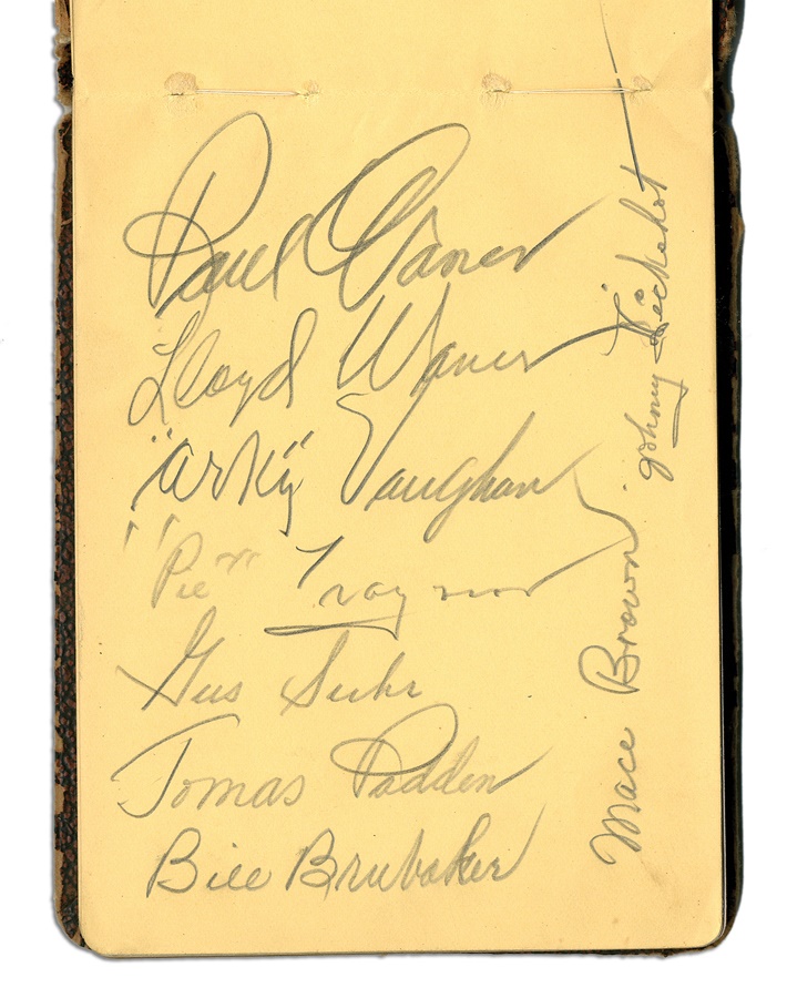 If you're a collector of classic autographs, this book is right up your alley. Signatures from several greats are here, with most in pen and a few in pencil, averaging 8/10. Among the key autographs: Lefty Grove, Herb Pennock, Moe Berg, Jimmie Foxx, Paul Waner (pencil), Lloyd Waner (pencil), Arky Vaughan (pencil), Pie Traynor (pencil), Tony Lazzeri, Joe DiMaggio (rookie signature), Mel Ott, Bill McKechnie, and more. The Lou Gehrig on the Yankees page is not authentic but rather is clubhouse signed. The book is in VG-EX condition. There are 100 signatures, all separated by team pages, with several unused pages in the middle.