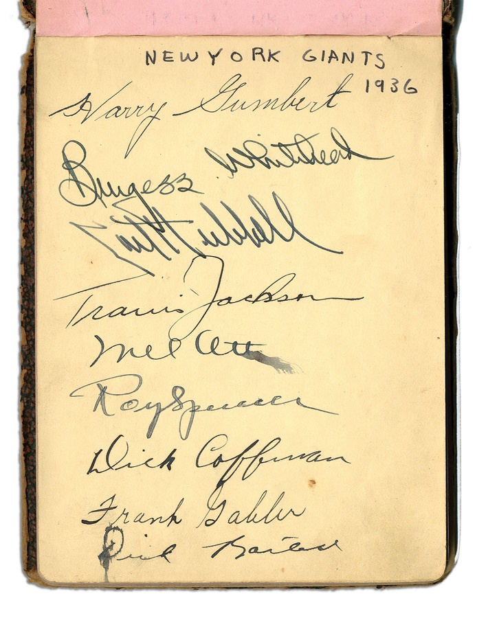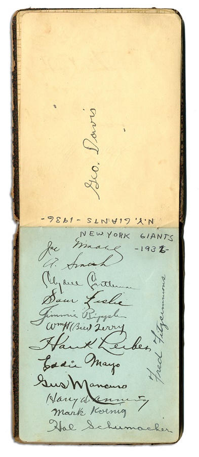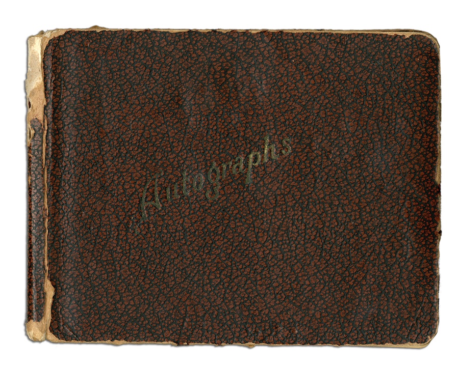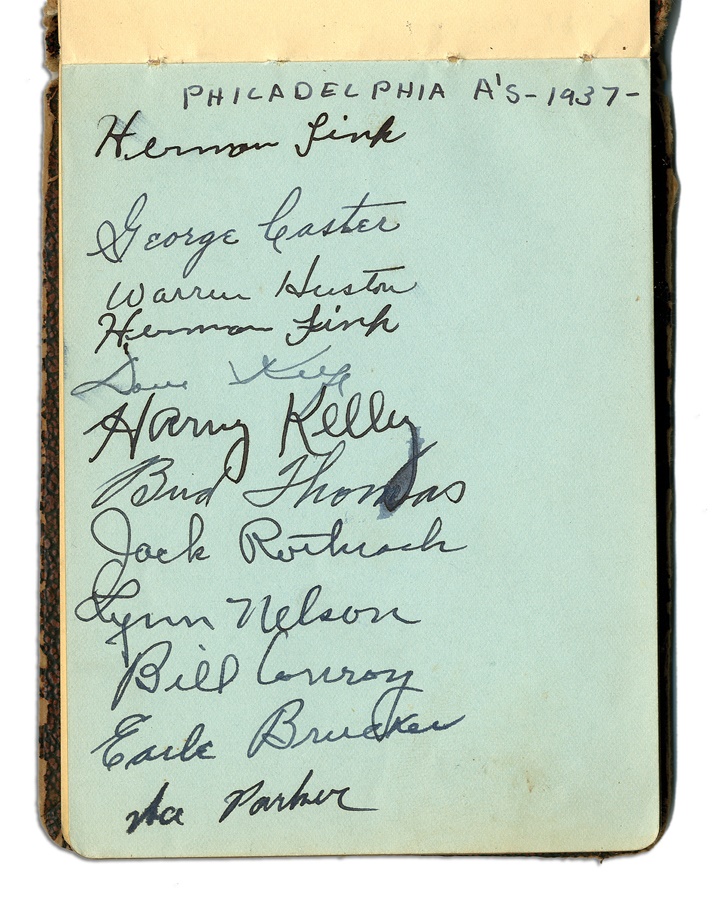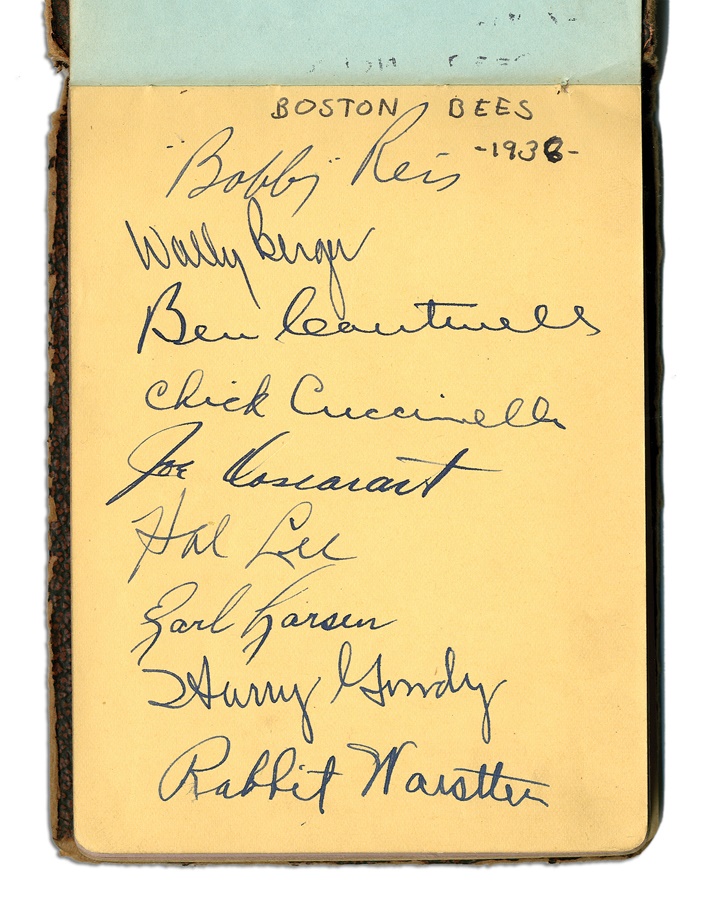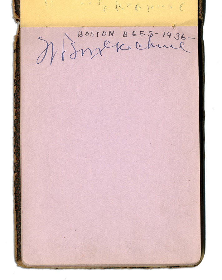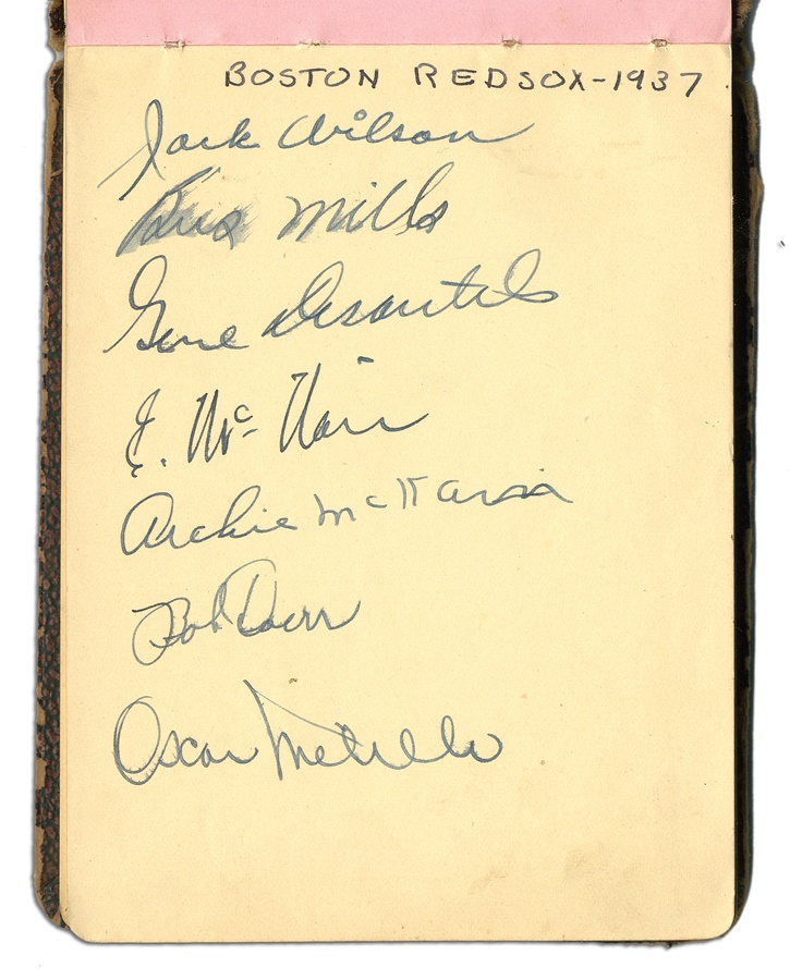 If you're a collector of classic autographs, this book is right up your alley. Signatures from several greats are here, with most in pen and a few in pencil, averaging 8/10. Among the key autographs: Lefty Grove, Herb Pennock, Moe Berg, Jimmie Foxx, Paul Waner (pencil), Lloyd Waner (pencil), Arky Vaughan (pencil), Pie Traynor (pencil), Tony Lazzeri, Joe DiMaggio (rookie signature), Mel Ott, Bill McKechnie, and more. The Lou Gehrig on the Yankees page is not authentic but rather is clubhouse signed. The book is in VG-EX condition. There are 100 signatures, all separated by team pages, with several unused pages in the middle.