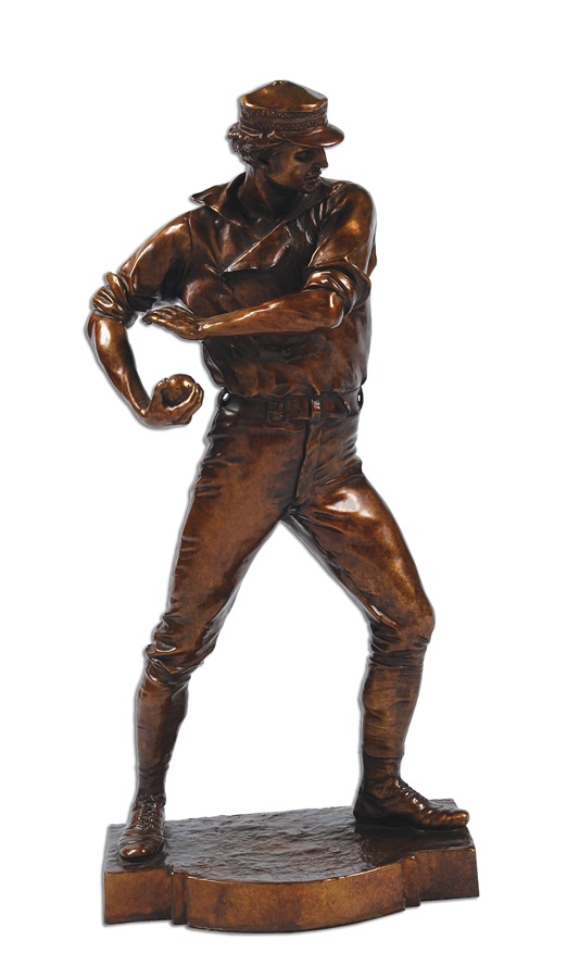 Douglas Tilden (1860-1935), known for his magnificent public works, sculpted THE BASEBALL PLAYER while in Paris in 1889. The life-sized statue was dedicated in Golden Gate Park, San Francisco, on July 8, 1891. It stands there today as one of America's oldest stationary baseball artifacts. This item is a first-generation original bronze statue, cast directly from Tilden's recently-discovered 1889 Plaster Model. While the enclosed literature indicates that this was intended to be part of a limited-edition run of 89, there were in fact only a handful done due to high production costs. The 21" high bronze weighing 27 pounds comes with documentation of its registration with Art Founders Guild of America, Inc., NYC, with a copyright date of November 4, 1988 and a casting date of November 1, 1993, listed as casting #14 of the expected edition of 89. A rare chance to own a special reproduction of one of the great pieces of American baseball art.