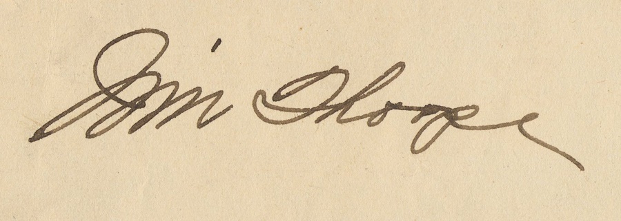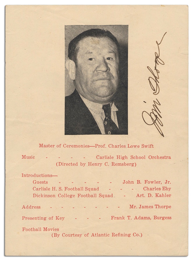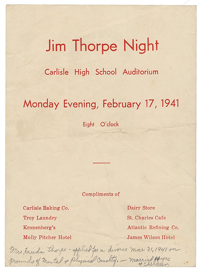 When Jim Thorpe enrolled in 1904, his school was known as Carlisle Indian Industrial School, but by the time he was honored in 1941 the Pennsylvania institution was simply known as "Carlisle High School." This is a one page, double-sided program from "Jim Thorpe Night," which was held at the school on February 17, 1941. On the side with the great athlete's photograph is his signature, rendered in 8/10 black ink. On the bottom of the verso, beneath the event's sponsors, is written a notation in pencil regarding Thorpe's divorce from his wife Freda, which took place weeks after this ceremony. The item has a light crease in the middle but is generally in Excellent condition.