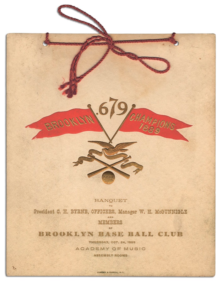 In 1889, the Brooklyn Bridegrooms held off the St. Louis Browns to capture the American Association title by two games. While they would lose that year's World Series to the New York Giants - the first post-season meeting between what would become historic rivals - there was still a championship to celebrate in Brooklyn. This item is a program from the banquet held to honor that team on October 24, 1889, at the Academy of Music. It measures 6x7" with a card stock cover and the pages bound together by red string at the top. Included is a list of toast presenters as well as dinner choices (filet mignon, squabs or quails, anyone?).