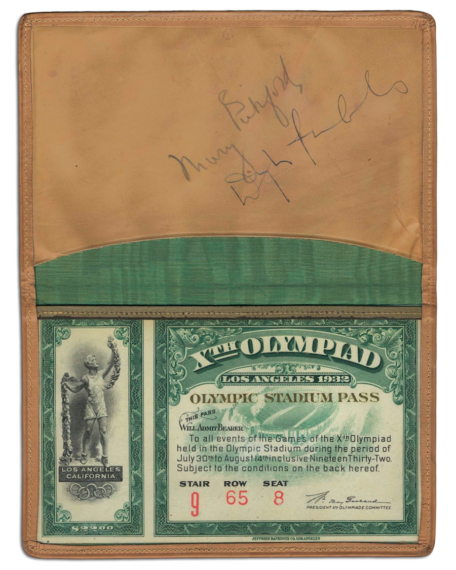 Lot # 764: 1932 Summer Olympics Season Ticket with holder Signed by Mary Pickford & Douglas Fairbanks