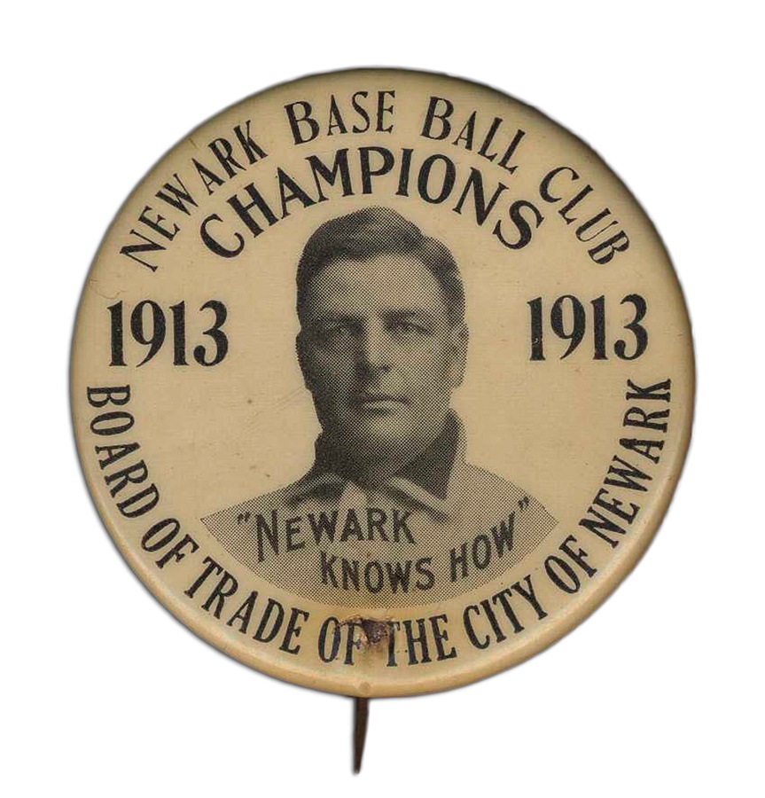 The Newark Indians were a member of the Eastern League from 1908-11, and then the International League from 1912-16. This rare 1913 pinback button celebrates that year's International League Champions Newark Indians team, which finished with a league-best record of 95-57. The pin is believed to depict team manager and former Major League catcher Harry Davis in his uniform, bearing the slogan "Newark knows how." It reads "Newark Base Ball Club CHAMPIONS 1913 - Board of Trade of the City of Newark." The item is in VG condition with one nick at the bottom center.