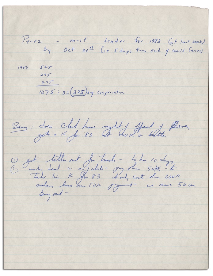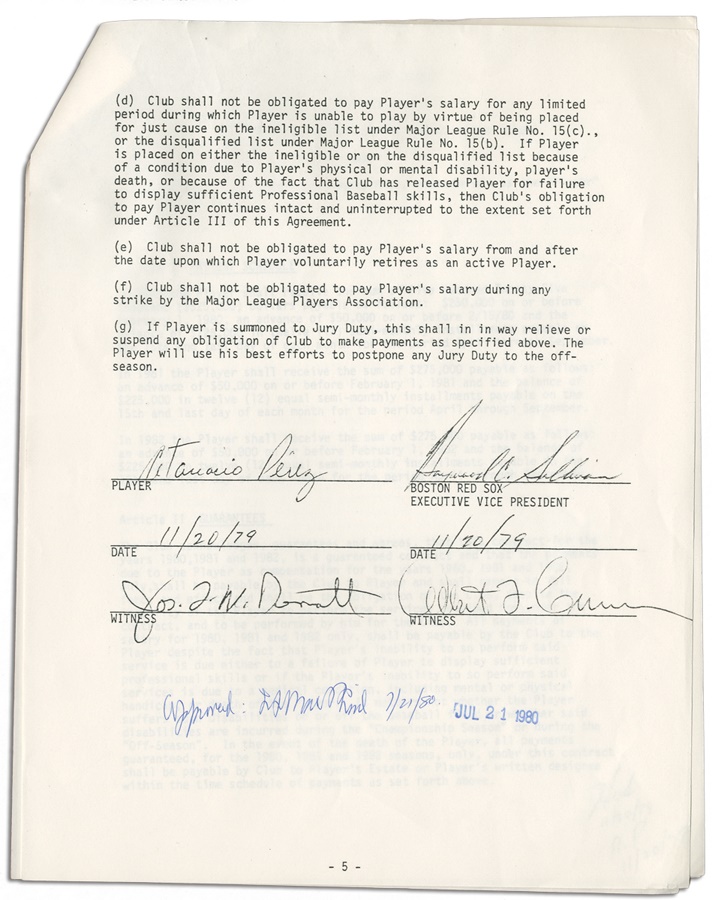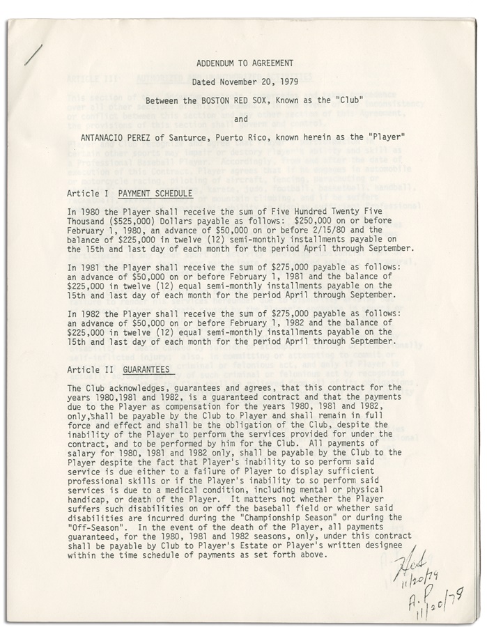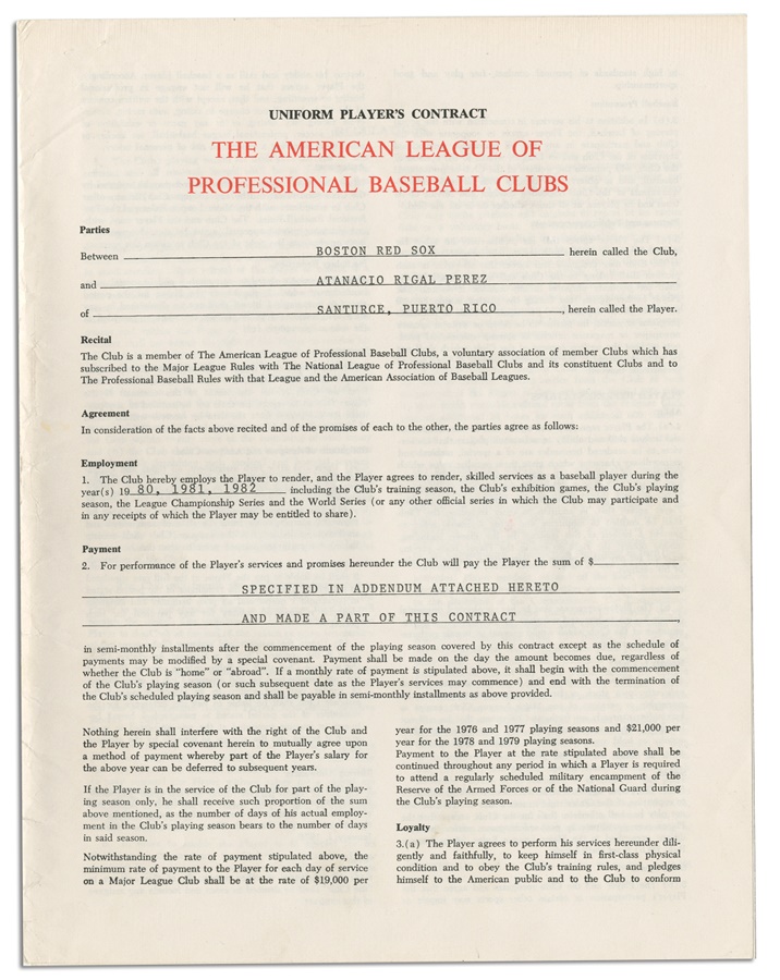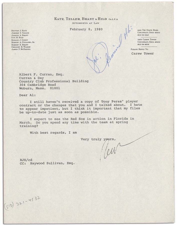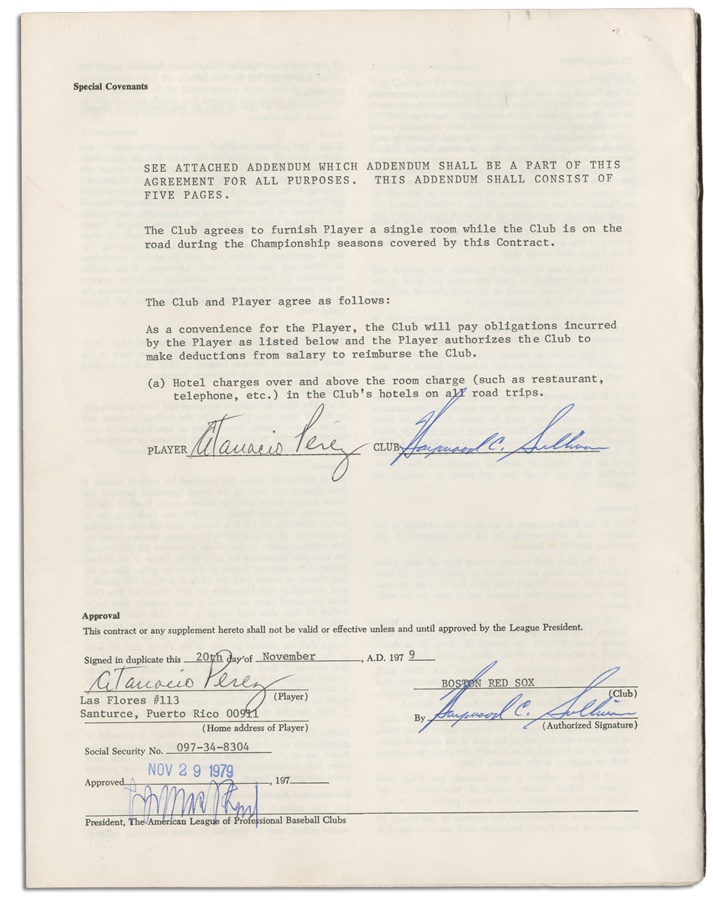 This hefty lot consists of Tony Perez's 1980-82 player contract for the Boston Red Sox and all sorts of related documents and correspondence. The contract itself is signed twice by Perez, both rare "Atanacio Perez" signatures in flawless black ink. It is also signed twice by Red Sox executive Haywood Sullivan and once by AL President Lee MacPhail. In some ways, the other docs are even rarer, including one releasing Perez from the Sox in '82, a copy of a '79 contract addendum signed by MacPhail, TLS dated 6/27/80 from Perez' lawyer to the team mentioning that he is leading the league in RBI, TLS dated 9/13/82 letter detailing which teams the slugger would accept an assignment to (interestingly, the Reds are not listed). A tremendous look inside baseball labor relations during the career of a future Hall of Famer.