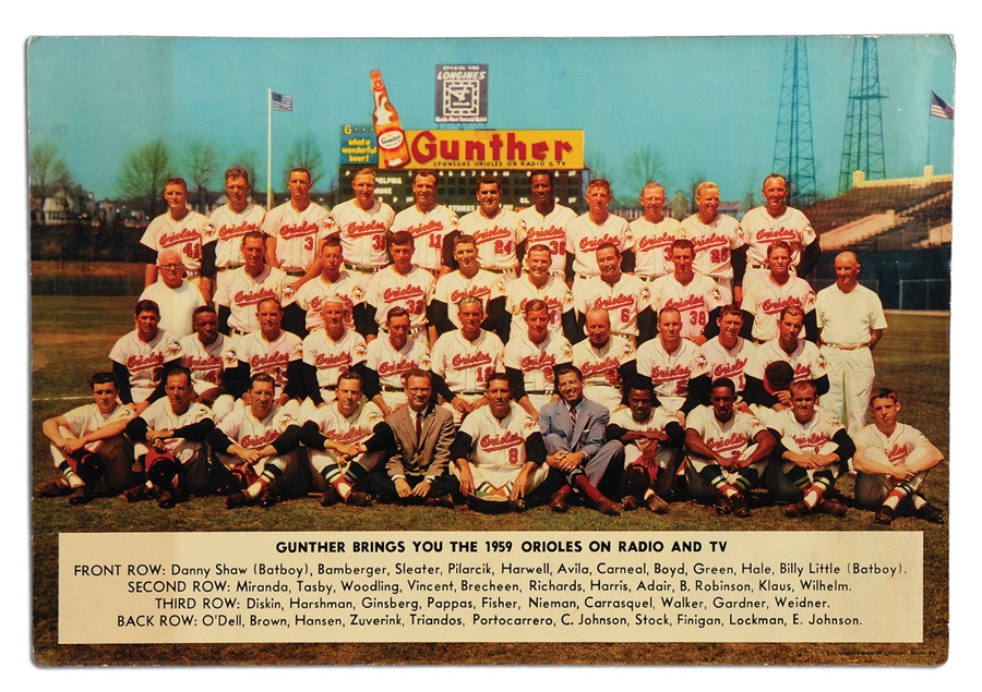 This paper advertising display commemorating the 1959 Baltimore Orioles measures 24x35", is mounted on board and is in EX condition. The '59 Orioles - just five years after their move from St. Louis - finished with a 74-80 record and in 6th place in the American League. The poster is sponsored by Gunther Beer, whose sign is clearly visible on the Spring Training scoreboard behind the four-tiered team photo.