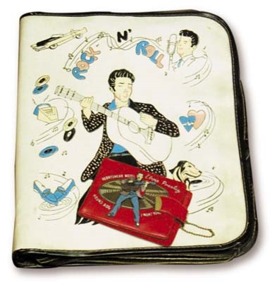 A classic red 1956 wallet (NRMT) along with a generic but great zip-pered un-licensed (11x14") vinyl two ring notebook that depicts the King on the front. VG-, with two splits and some age wear.