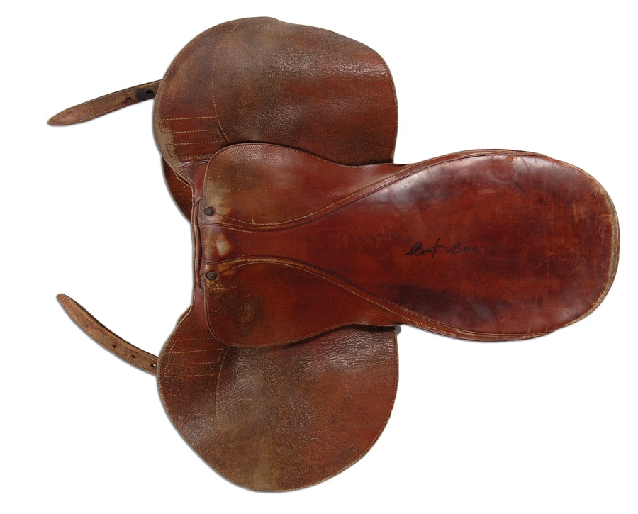 July 6, 1975 was to be the culmination of months of publicity that had put a thoroughbred horse race on the map as perhaps no other had before. It was a one-on-one match race, a "battle of the sexes" between record-holding filly Ruffian, and Kentucky Derby-winning colt Foolish Pleasure. Held at New York's Belmont Racetrack, the event attracted 50,000 fans in attendance, and another 20 million watching live on national television. Ruffian was maintaining a narrow lead about halfway through when the bones in her foreleg gave way and she was euthanized later that evening. Jacinto Vasquez was the regular jockey of both horses and elected to ride Ruffian in what would sadly be her final race. Noted jockey Braulio Baeza was chosen to ride Foolish Pleasure, and this is the saddle he used on the winning horse on that fateful day. The leather saddle measures about 16" in length at the seat, and about 20" wide across the flaps. It shows nice use and is in Excellent condition. Also comes with Letter of Authenticity.