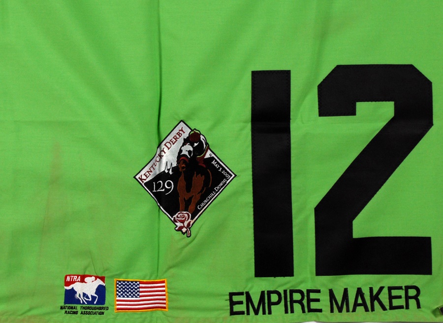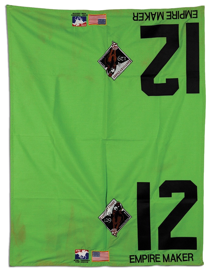 This green saddle cloth belonged to American Thoroughbred racehorse Empire Maker, who competed in the 2003 Run for the Roses at Chuchill Downs as a three-year-old. Sired by 1990 Kentucky Derby champion Unbridled, Empire maker finished second to Funny Cide before eventually winning the Belmont Stakes. The saddle cloth measures 35x47," is in EX condition and features the colt's name and number "12" on both sides. There are also a pair of patches for both the 129th Kentucky Derby, National Thoroughbred Racing Association and American flag, one on each side. There is evidence of some use near the edges. Includes LOA.