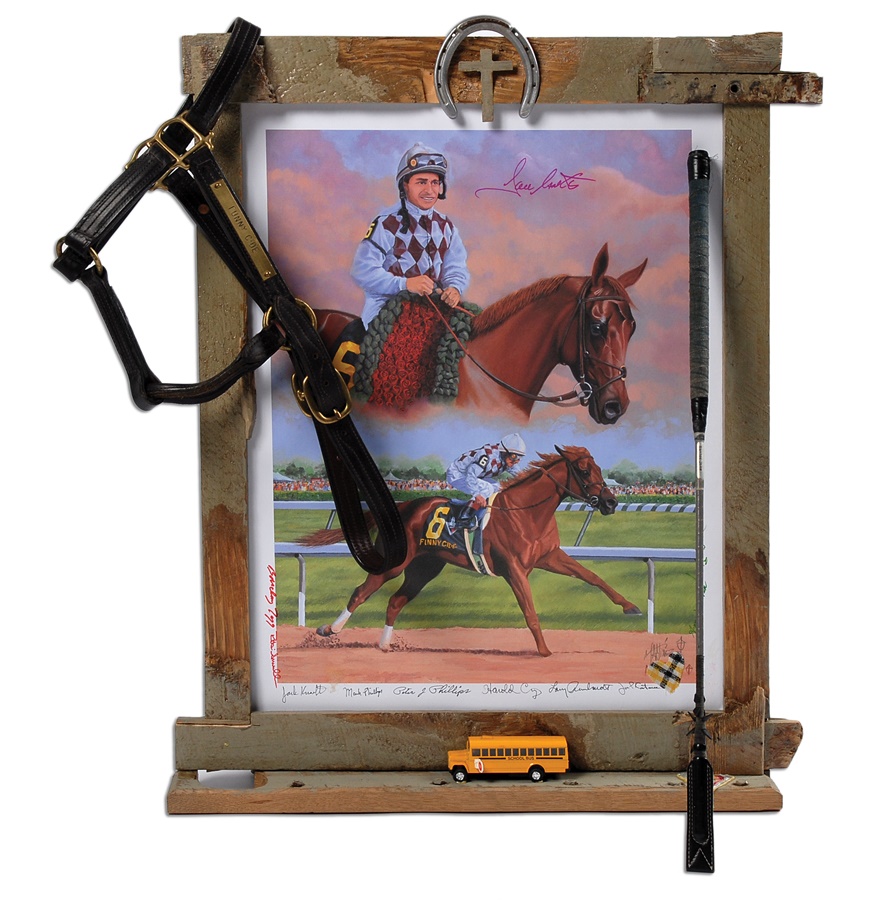 Jockey Jose Santos made his fame aboard thoroughbred Funny Cide, winning both the Kentucky Derby and the Preakness in 2003. Ironically, while Funny Cide was the first New York bred horse to win the historic Derby, it was a third place finish at the Belmont Stakes in NY that dashed his Triple-Crown hopes. This lot includes a framed poster made exclusively for Santos which was actually made from Funny Cide's stall at Saratoga. Autographs include Jose Santos, trainer Barclay Tagg, and all of Funny Cide's owners. The poster also includes a horseshoe worn by the champion horse. Lot also includes the unique halter worn by Funny Cide and his sire, Distorted Humor as well as the Jose Santos whip used on Funny Cide in the inaugural maiden breaking race of his career. A great collection of items from racing history. Includes LOA.