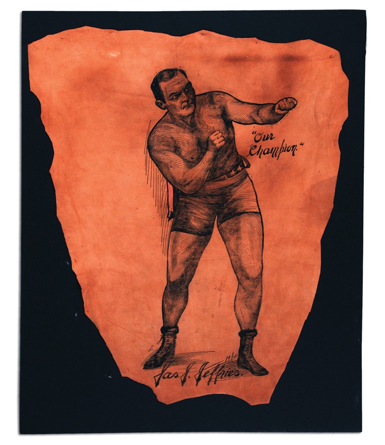 This is an illustrated vintage leather for then world heavyweight champion James J. Jeffries. Entitled "Our Champion" with a facsimile signature of Jeffries at the bottom. Beautiful image of Jeffries in full fight pose as he looked at the height of his career. The image and print are bold and clear. There are tack holes on the perimeter and some ninor soiling. Irregularly shaped to 23x30." Jeffries was champion from 1899 to 1905 and this leather dates to his reign.