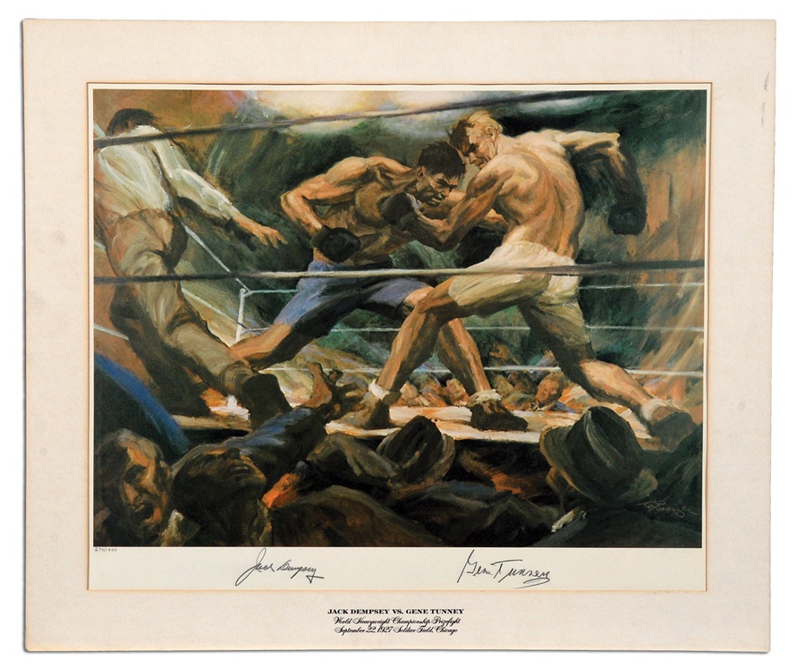 Offered here is a boldly signed, numbered lithograph issued in the 1970s by Sports Illustrated of Jack Dempsey and Gene Tunney. The lithograph has bold color and is clean with no creases or tears. Matted at the time, bold signatures of both in pencil at the bottom, with some minor soiling on matte. Numbered 270 of 1500, measuring 21x24.5." A great dual-signed lithograph commemorating one of the best remembered rivalries in boxing history.