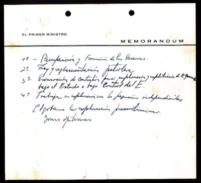 A rare document handwritten on Prime Minister sta-tionery in mint black ink by Castro as Prime Minister (when Urrutia was the figurehead President). The doc-ument names four ways for Cuba to be independent concerning oil including regulation of Reserves, petrole-um regulations (laws), state control of petroleum, and the government working with small independent com-panies on exploration. 8.5x7.5" and EX.