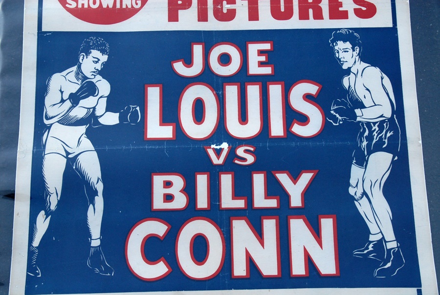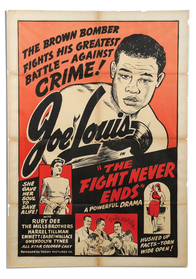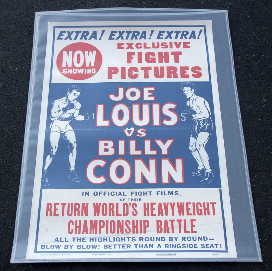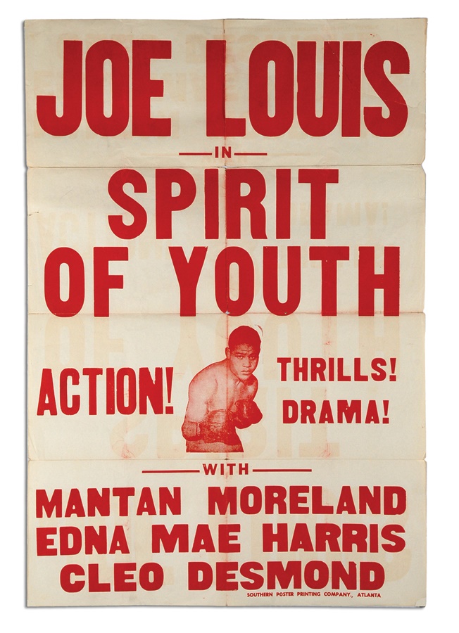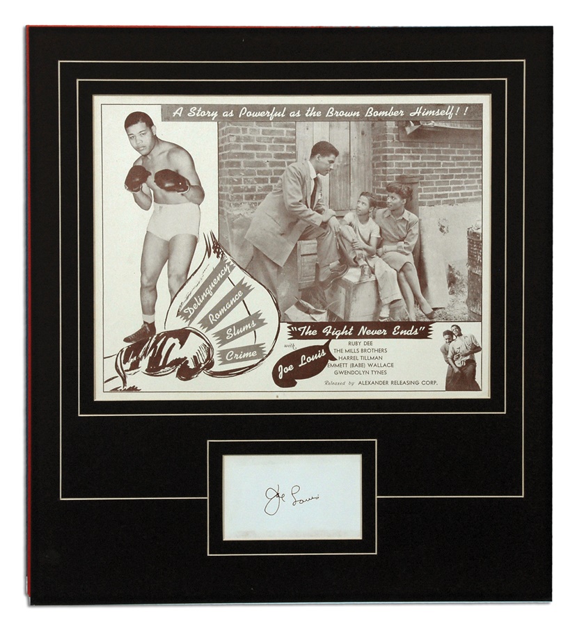Offered here is a terrific group of original Joe Louis movie and fight film posters and lobby card. Included are: The Fight Never Ends (one sheet, edge tears with original folds, Good), Spirit Of Youth (one sheet, edge tears, original folds, Good), Louis-Conn II Fight Film Poster (one sheet, on linen, some tears at folds and fading, Good), and The Fight Never Ends Lobby Card with Joe Louis Ink Signature (matted together, lobby card is EX, ink signature is large, bold and clean). A seldom seen grouping from the film career of "The Brown Bomber."