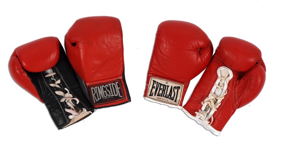 Offered here are two pair of original fight worn gloves used by Tommy "The Duke" Morrison in fights early in his career. First are the gloves he used against Aaron Brown in New Jersey on July 3, 1989, a fight Morrison won by 6-round decision. These are Ringside, black and red leather, 10 ounce gloves with laces in nice condition. Second we have the Everlast, 10 ounce gloves with laces used by Morrison to outpoint Lorenzo Cannady in New Jersey on November 14, 1989, a six-round decision. Also in nice condition. Comes with a letter of authenticity from Steve Lott, a member of Morrison's early management team.