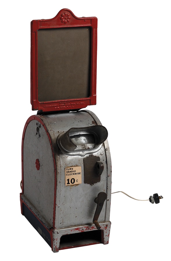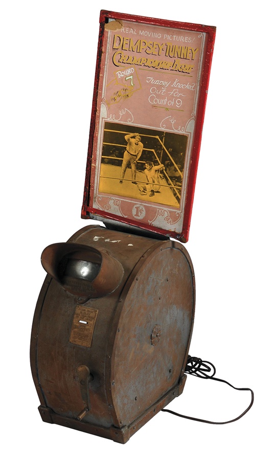 Offered here are two early 20th century Mutascopes used for viewing fights of the era. Both machines are classic metal, manufactured by the International Mutascope Reel Company. One has a label "Turn Handle Clockwise 10 C." Both have the Mutascope trademark. Approximately 13x8x17" (high). The first has a sign in metal holder with a cardboard card for Dempsey-Tunney II (11.5x20" with some small holes). The second has the holder, but no advertising card, although the reel itself is present. A few minor dings, otherwise fine. All original without legs. Not sure if these are in working order and are sold in "as is" condition.