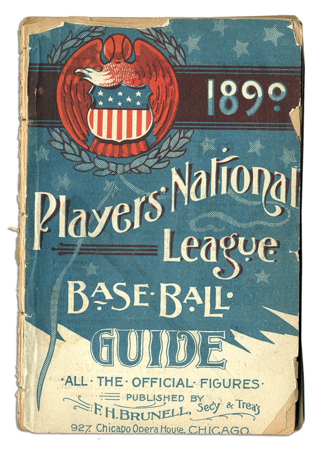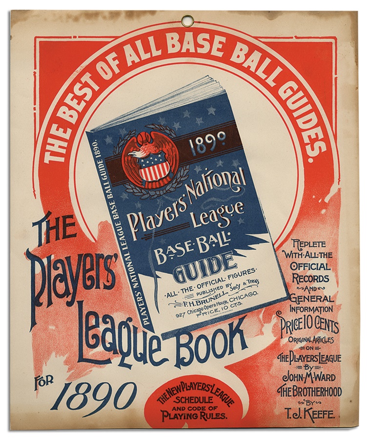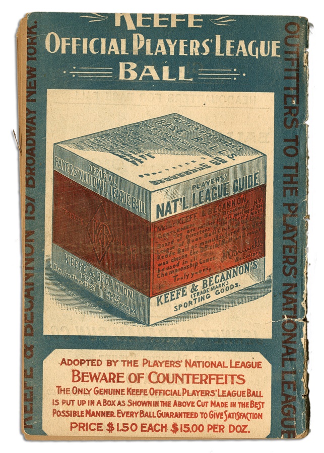 Long before the advent of players' unions and work stoppages, team owners ruled the roost and players didn't always see eye-to-eye regarding their treatment. Such was the impetus of the formation of the "Players' League" in 1890, as a counterpart to the National League and the American Association. While the league only lasted for that one season, it served its purpose in making changes to the sport which exist to this day, such as the implementation of the "infield fly" rule. This 128-page guide is rarer than hen's teeth and the 11x13" card stock ad is the only one known. Eight teams participated in the lone season, with most in major markets and several having counterparts in the other leagues, culminating with the Boston Reds finishing in first place. While the league was deemed to be a "minor league" decades later, the Players League is still considered one of the turning points in the history of the sport of professional baseball as it is known today. The in-store advertising sign is heavy stock with a grommet at the top for hanging. There is some foxing and water marks around the edges but other than that, it is beautiful with no rips or creases. The guide is a bit tattered with loose pages and a couple missing toward the back, and chipping around the edges.
