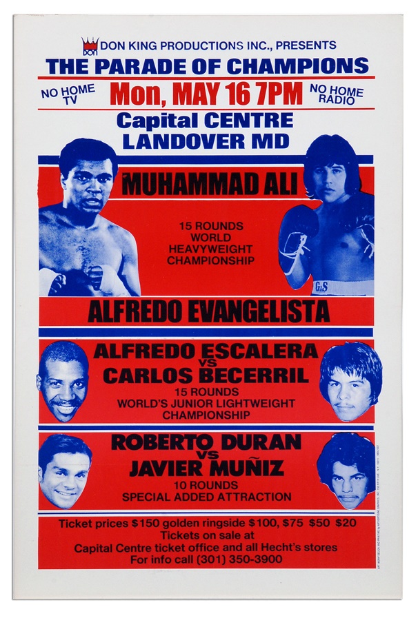 On May 16, 1977 in Landover, Maryland, heavyweight champion Muhammad Ali defended his title against Alfredo Evangelista. Ali prevailed, winning a unanimous 15-round decision. On The undercard Roberto Duran won a ten-round unanimous decision over Javier Muniz. Offered here is a scarce on-site poster to the event. This on-site poster is cardboard picturing the main event and undercard fighters. Clean front and back, not creased. Bold color and images. About as nice an example as you will find. Measures 14.5x22.5."
