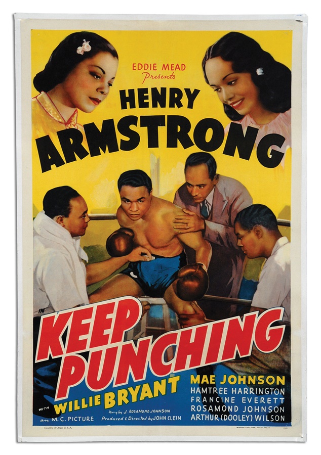 This is an original advertising film poster for the movie "Keep Punching" starring Henry Armstrong, an M.C. picture. This fictional story is about a gambler/boxer who is destroying his life in the fast lane. This marvelous poster is paper and has been professionally linen backed. It features bold color and print and an outstanding image of the great Henry Armstrong. One of the most beautiful movie posters featuring a boxer we have offered. EX+ condition, measures 27.5x 41" (one sheet). Seldom seen.