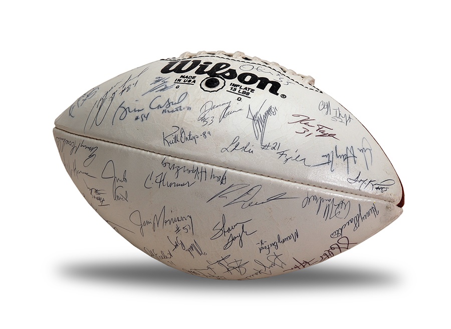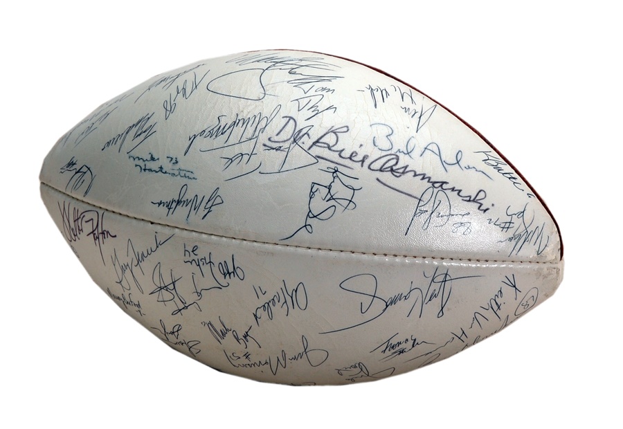 The "Super Bowl Shuffle" may not enter any musical hall of fame, but the 1985 Chicago Bears, who recorded that track, certainly made their place in sports history. The 1985 Bears would go 15-1 during the regular season and their song would prove prophetic, as they would go on to victory in Super Bowl XX. This official Wilson NFL football has white panels for signing and is in EX-MT condition. The signatures - over 50 in all including the likes of Walter Payton, Jim McMahon, and Mike Singletary - have been covered with a clear protective coating and average 8/10.