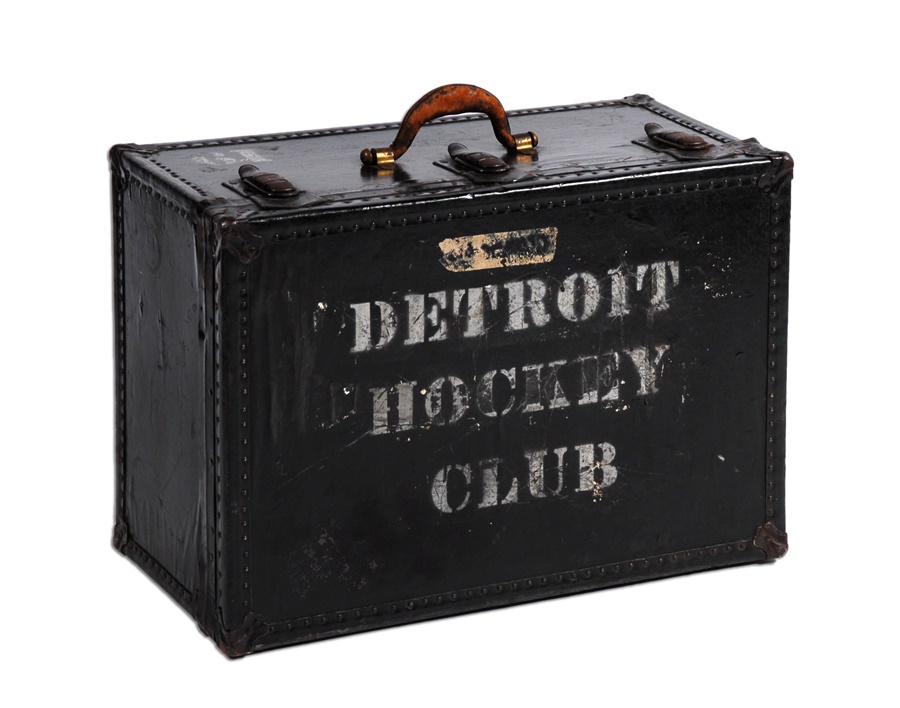 Despite having an otherwise largely uneventful career, Paul Henderson forever became a legend in Canada by scoring winning goals in the final three games of the 1972 Summit Series between Canada and the USSR. This item dates to his playing days with the Detroit Red Wings and came directly from their old home, Olympia Stadium. The equipment trunk is all black, measures 26x18x12.5" and weighs a sturdy 19.5 pounds. The top features the words "DETROIT HOCKEY CLUB" painted white in stencil, with Henderson's "19" also in white stenciled on the front. The metal clasps and hinges are rusty but well functional, and there are signs of wear and some peeling of the exterior layer on the bottom, but the item is generally in Very Good condition.