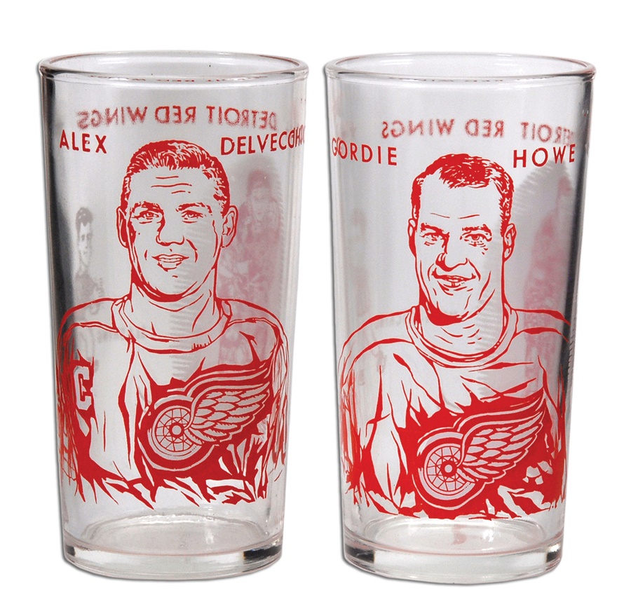 These collectibles have increased in value in recent years and are becoming more difficult to find. The York Peanut Butter company manufactured a series of glasses with various themes, including NHL hockey players. These two are part of a set of Detroit Red Wing glasses and feature legends Gordie Howe and Alex Delvecchio. They are each approximately 4.75" high and hold 10-12 oz, and each features a close-up illustration of the player depicted, as well as a full-body drawing and an image of a referee making a penalty call (Delvecchio's is slashing, Howe's is high sticking). There are no chips or blemishes visible, both of these items are in NRMT condition.