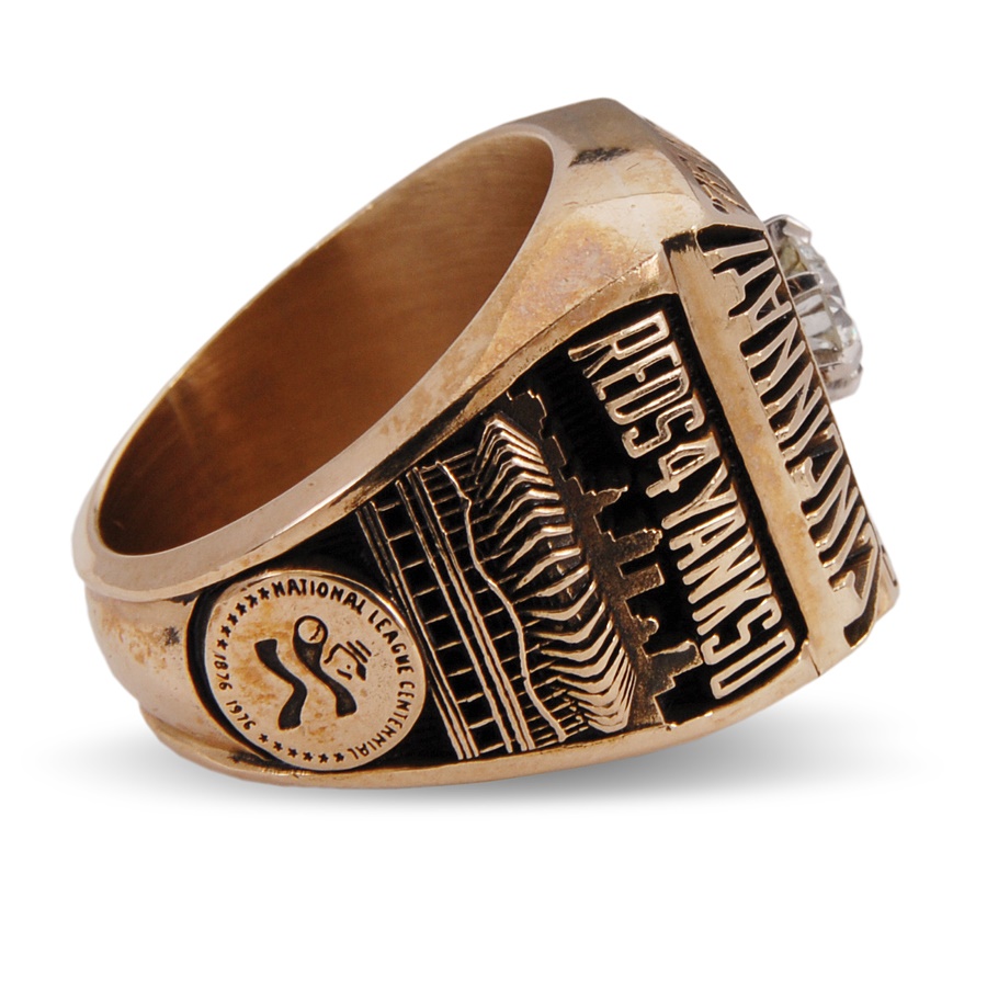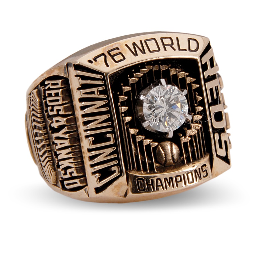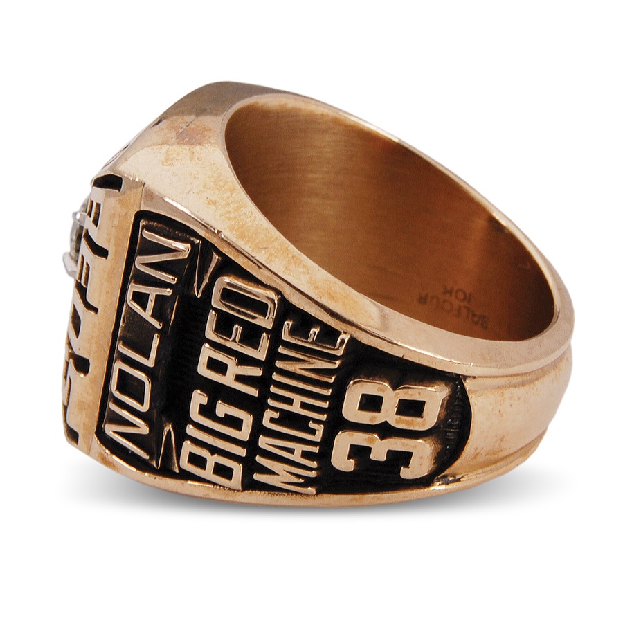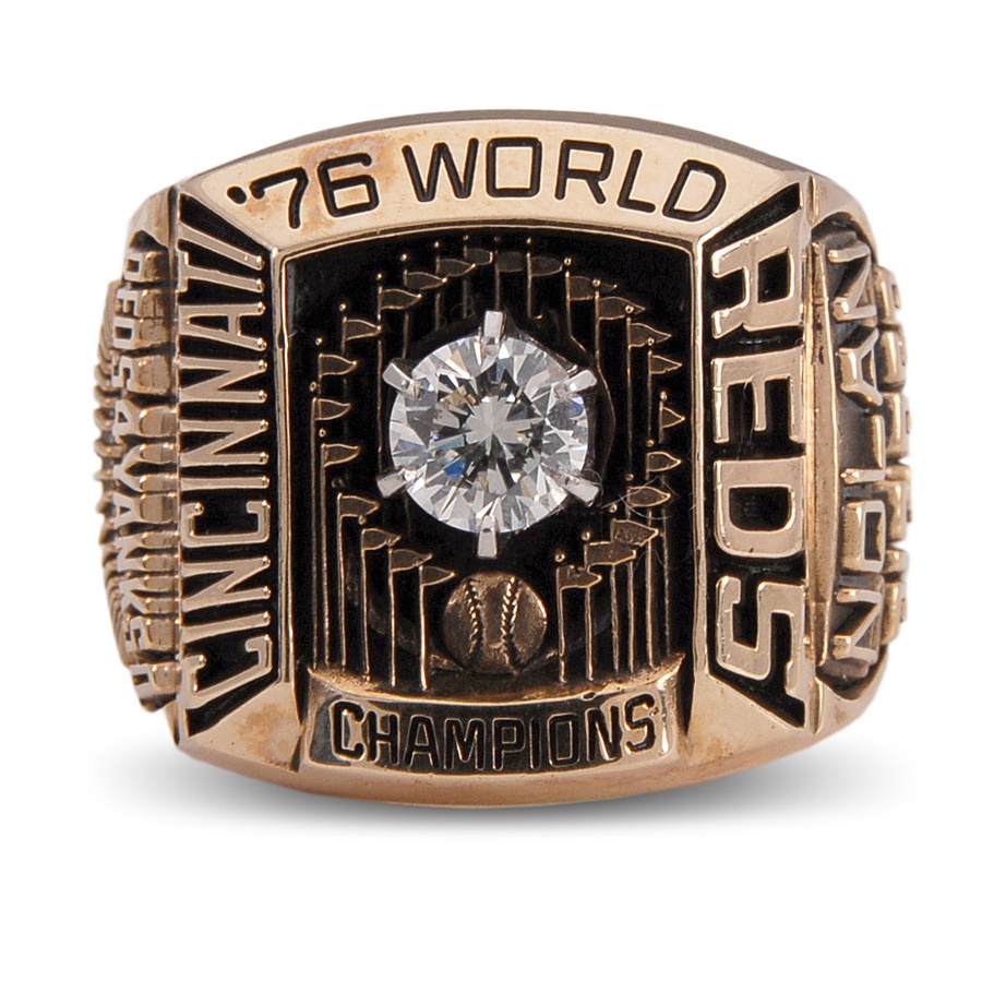 One of the vital cogs of Cincinnati's Big Red Machine was pitcher Gary Nolan, who went 15-9 for the 1976 Reds, not including his victory in the final game of that season's World Series. Our consignor acquired this ring directly from Mr. Nolan many years ago, and It has never before been offered publicly. The ring is 10K gold, size 8 1/2 from Balfour and featuring a real diamond in the center, situated inside the World Series trophy and featuring the word CHAMPIONS at the base. The wording on the top reads: '76 WORLD, with CINCINNATI on the left and REDS on the right. The left shank gives the games total: REDS 4 YANKEES 0 atop Riverfront Stadium and a bicentennial logo. On the right shank is NOLAN's name and number 38, with BIG RED MACHINE in between.