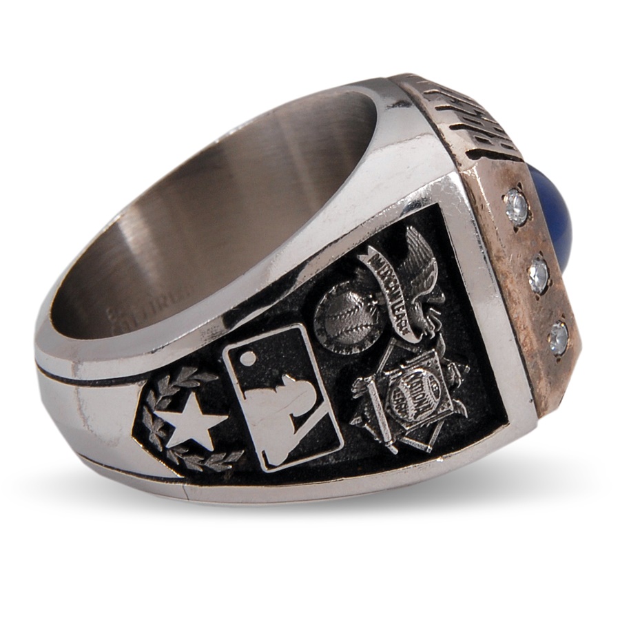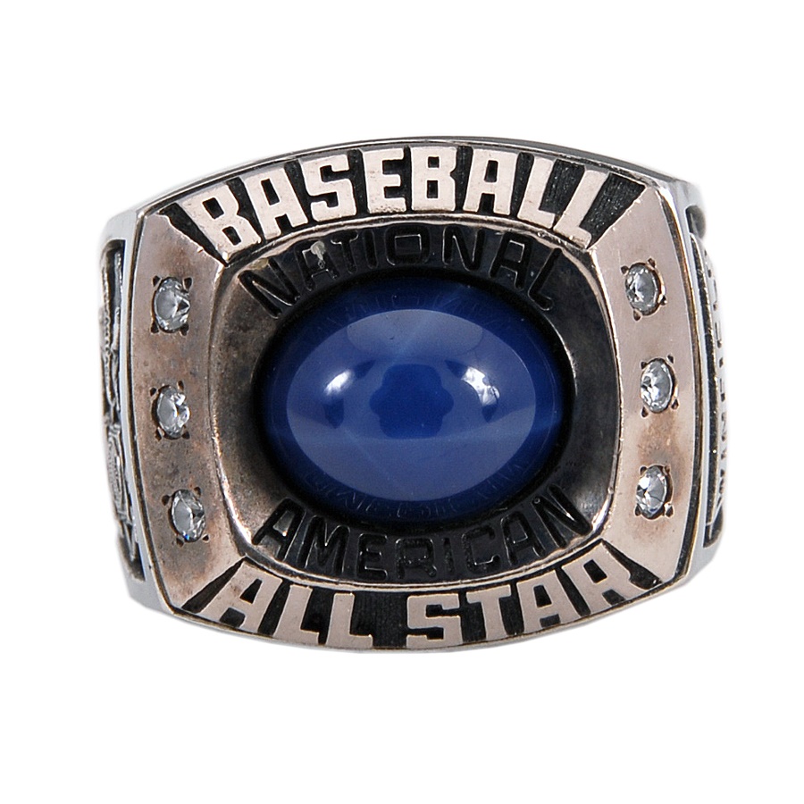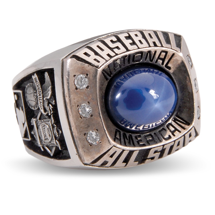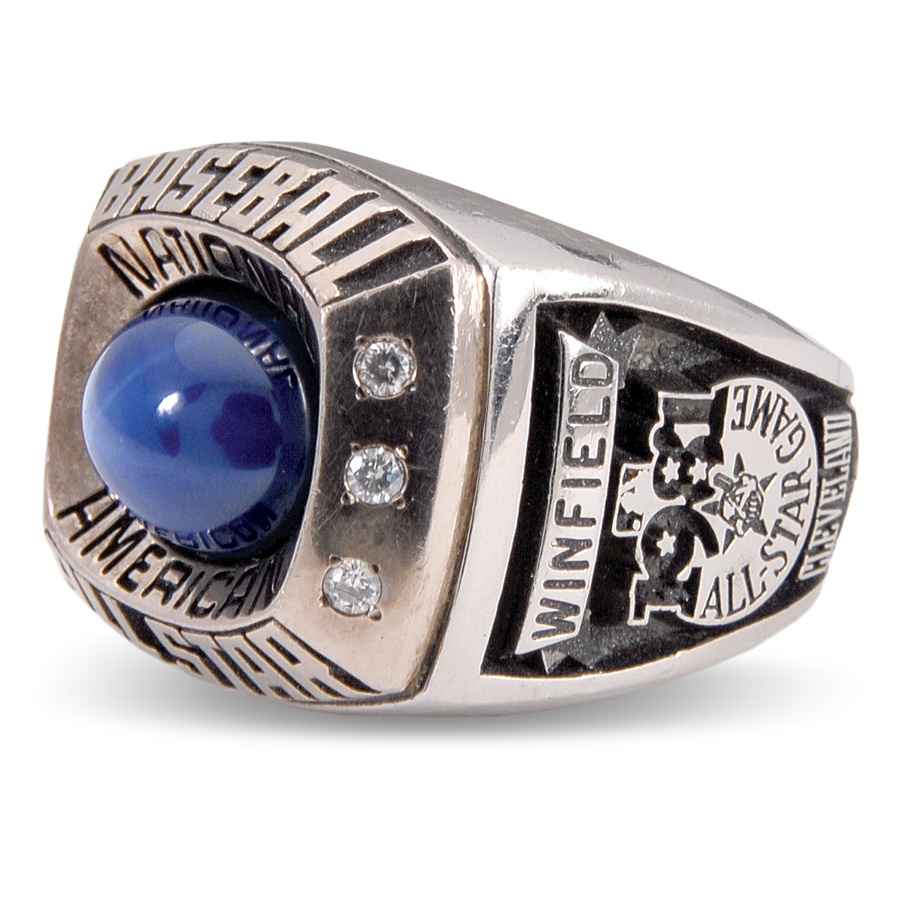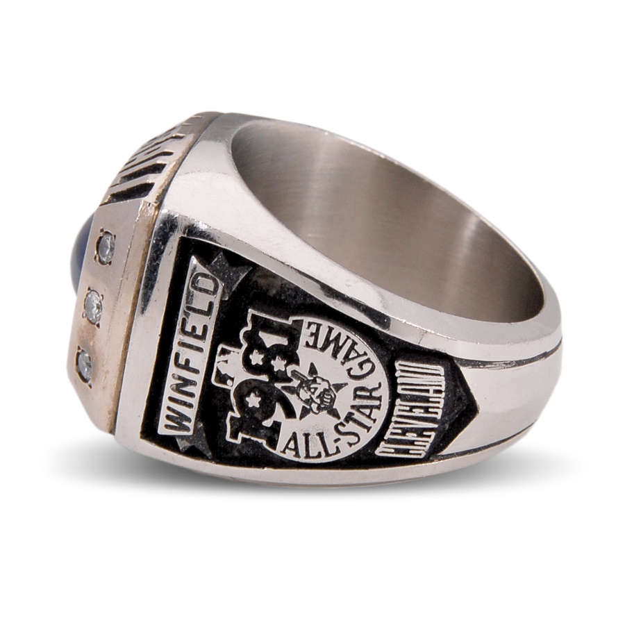 In 1981, new Yankees left-fielder Dave Winfield became baseball's highest-paid player, and he proved his worth by becoming an All-Star for a fifth straight season - and first in the AL. Here's the jewelry he won for his prowess on the playing field: a silver, size 10 1/2 ring from Balfour Celestrium that showcases a blue stone in the center with the word BASEBALL above it and ALL STAR below it. Indented in the middle are the words AMERICAN and NATIONAL. There are three diamonds on both sides of the face. On the left shank are the AL, NL and MLB logos, as well as a star icon. On the opposite side is the 1981 All-Star Game logo with Winfield's name above it and CLEVELAND below.