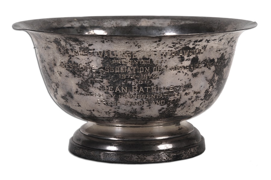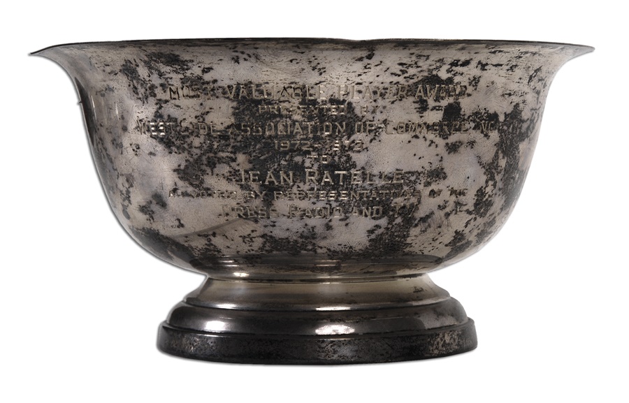 Joseph Gilbert Yvon "Jean" Ratelle is a former Canadian ice hockey player and a member of the Hockey Hall of Fame. A product of the New York Rangers organization, Ratelle's hockey career almost ended when he suffered a serious back injury at age 23 and had to undergo major spinal cord surgery. He recovered to become a regular with the Rangers from 1963 until 1975 and was the perennial scoring leader for the Rangers between 1968 and 1973 when the team was a powerhouse.Ratelle was poised to beat out Boston Bruins' legend Phil Esposito for the scoring title in 1972 before he lost fifteen games due to an injury, but came back for the Stanley Cup finals against Boston to lead his team. Offered here is a silver cup awarded to Jean Ratelle as the Rangers MVP for the 1972-73 season. Awarded by members of the press and radio. Silver cup is tarnished, but would clean up nicely. Important award for one of the Ranger greats.