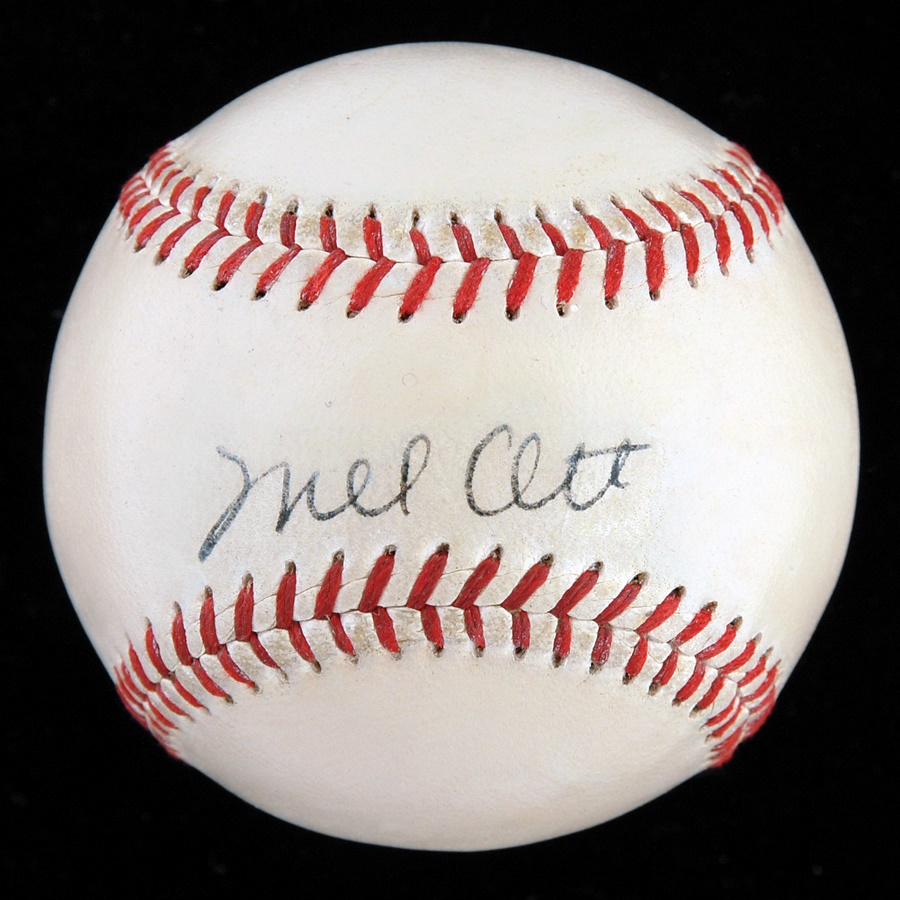 For most of the 20th Century, Mel Ott was the closest thing to Babe Ruth the National League had seen, racking up 511 home runs and 1,160 RBI in his 22 seasons with the New York Giants, the last six as player-manager. Displays as a NRMT-MT single-signed baseball - a Spalding Official League model. A closer look reveals that it has signature removals. This was done professionally and is not noticeable by the naked eye. One of the nicest Mel Ott signed baseballs that we have ever seen. From 1928-45, Ott led the Giants in home runs; The 18-season consecutive dominance being a record as no other player has ever led his team in more consecutive years in a single Triple Crown category. In addition, he is one of only five National League players in history to record 100+ RBI in eight consecutive seasons (later matched by Willie Mays, Chipper Jones, Sammy Sosa and Albert Pujols. The Hall of Famer and 12-time All-Star was both the youngest player to hit 100 home runs and the first National Leaguer to hit 500 roundtrippers. JSA LOA.