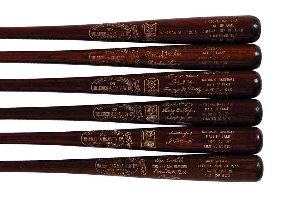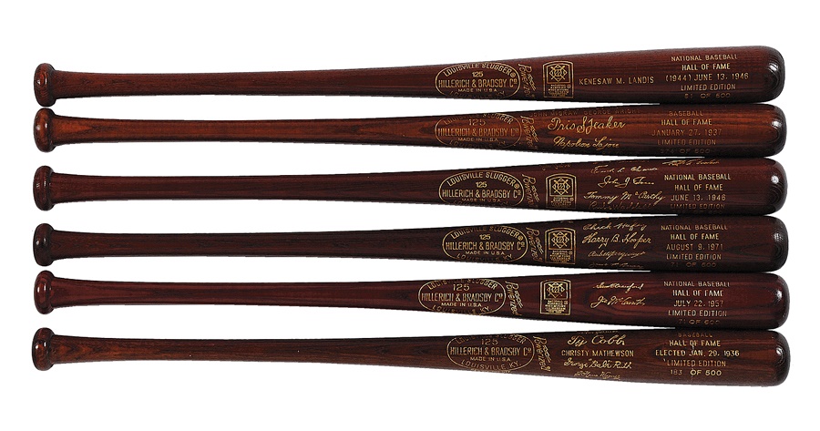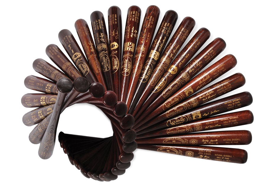 Each year, the Baseball Hall of Fame in Cooperstown, NY, issues a series of items in commemoration of that year's class of inductees, as well as other special events. This is a rare opportunity to own nearly ever year of the brown souvenir baseball bat created for the annual class. It includes a run from 1936 to 2011, and only two years of issue are missing -1958 and 1960. Each bat contains the date of induction, engraved signatures of all of the honorees, as well as the number in the series of each year's limited edition. The numbers on the bats vary. Overall these items are in NRMT condition.