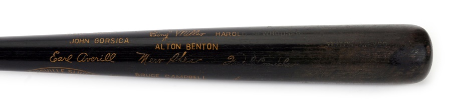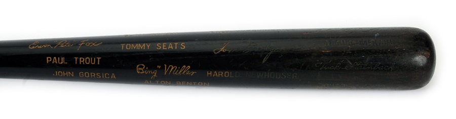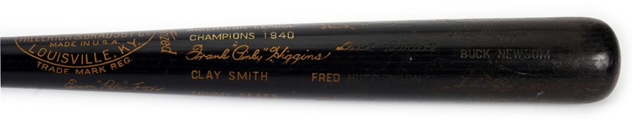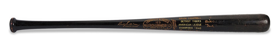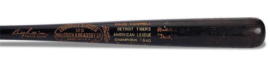 Louisville Slugger manufactured this piece of lumber in tribute to the Detroit Tigers in recognition of their American League pennant in 1940. The bat has the names of the members of that squad engraved, some of them with autograph reproductions and others with the name in all caps. While the names are all stamped in gold writing, there is fading toward the barrel and while the outlines of those names are still visible, the gold writing has worn off, though the bat itself is in Excellent condition. Members included on this item are the likes of Hank Greenberg and Earl Averill. While the Detroit crew came up short in that year's World Series, this is still a nice keepsake in recognition of a team that won 90 games and the AL pennant.