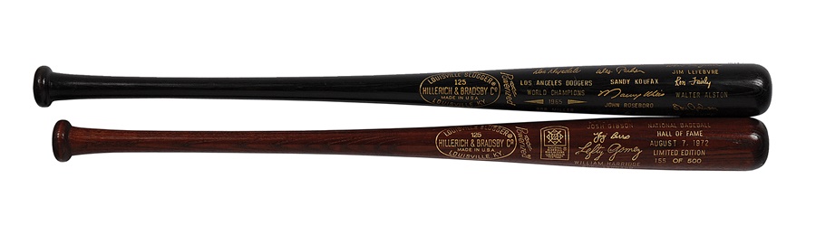 Included in this lot are a pair of baseball bats as well as a pennant. The bats are both H&B Louisville Sluggers, with the brown one stamped as a limited edition #155 of 500 from the Hall of Fame, August 7, 1972, and the black model paying tribute to the 1965 World Champion Los Angeles Dodgers. Both models include the name of Sandy Koufax (all names are factory-engraved), among many others. The pennant celebrates the "National League Champion" Dodgers, and includes a black and white team photograph stapled on it. All of these items rate in VG-EX condition.