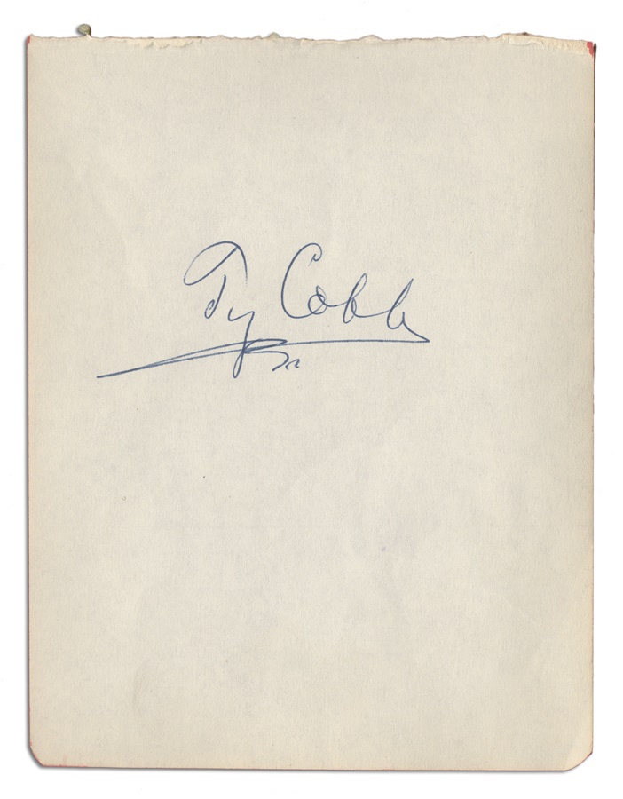 Until Pete Rose eclipsed his mark in 1985, Ty Cobb was the all-time leader for most career hits in the Major Leagues. Amazingly, Cobb still places second on that list, a testament to his talent and durability over a 24-year career. This item is a 4.5x6" piece of paper, blank except for the single signature of the "Georgia Peach" in 8/10 blue ink. The page appears to have been torn from a book but is otherwise in excellent condition.