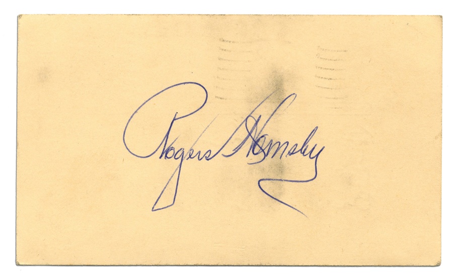 This 3x5.5" card is signed by Baseball Hall of Famer Rogers Hornsby. It is postmarked from Chicago, Illinois, and dated November 13, 1952. The postage (which is printed onto the card) is for two cents. While there is some yellowing from age and the addressee's name is faded, Hornsby's flowing signature is very clear in 9/10 blue ink. There is a smudge on the signature side near the surname.