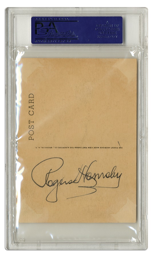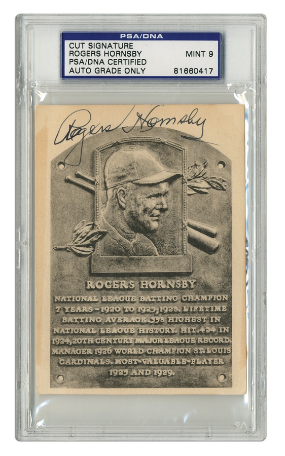 This post card, featuring the Hall of Fame plaque of St. Louis Cardinal legend Rogers Hornsby is signed twice by the man known as "The Raja." Hornsby signed on the front in black ink as well as on the reverse in blue. The card displays some yellowing and there are some tape marks on the edges but the card is in Excellent condition, and the signature is PSA/DNA certified MT 9.