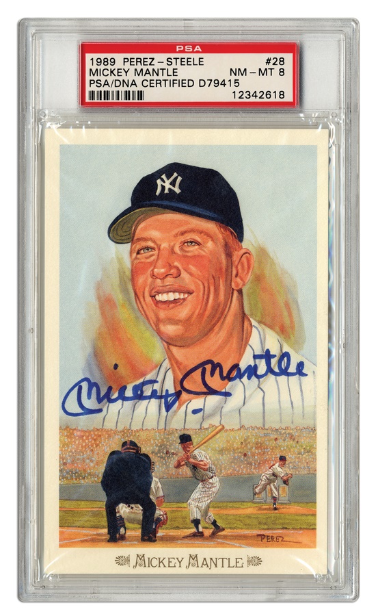 This post card was created by the Perez-Steele gallery as part of a numbered set and features a color illustration of Mickey Mantle on the front, in a head shot on top and in an action pose about to swing the bat below. The card is signed across the front by "The Mick" in blue Sharpie, while the back notes Mantle's 1974 induction into the Hall of Fame, along with that organization's 50th anniversary logo. It is marked as Card 28, and part of Set No 00892 of 10000. PSA/DNA Certified, NM-MT 8.