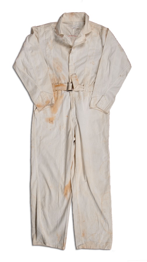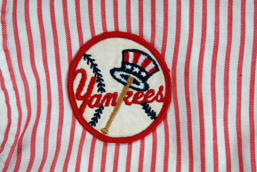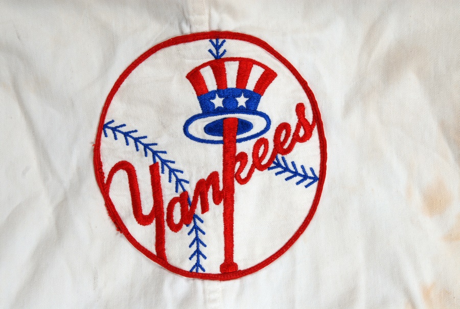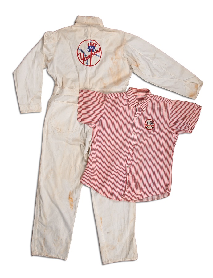 This two-piece set dates from the 1960s-70s. The first item is a vendor's shirt, short sleeve, collar size 15 1/2. It is red-and-white striped with a Yankees patch on the left breast. The other is a full-body jumpsuit, all white, with size 40 tag in the collar. It zips up the front; the slider is intact and functions properly, however the pull tab is missing. There is a snap button above the zipper and it buckles in front. The Yankees Top Hat and Bat logo is stitched onto the back, and there is staining on both front and back and on both legs. These unique items are throwbacks to the days of the original "House that Ruth Built."
