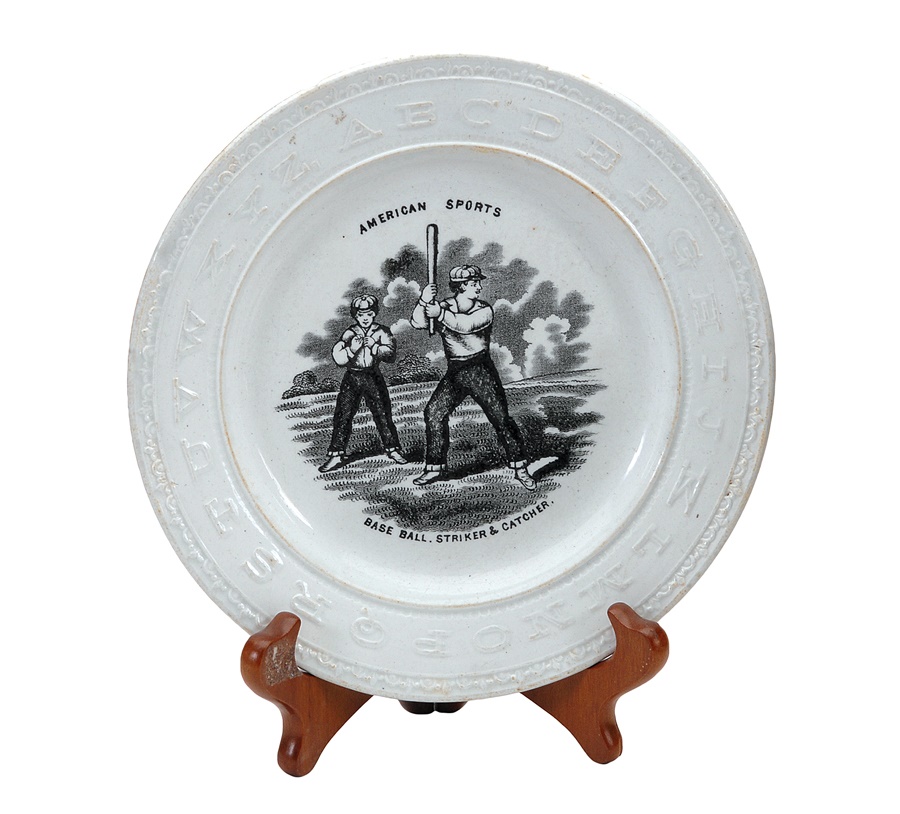 This rare and very attractive Brown Transfer, Soft Paste Plate measures 8" in diameter. In the center is a decoration depicting a baseball game in progress. Above the scene is text that reads, "American Sports," and below it reads "Base Ball, Striker & Catcher." This series of Staffordshire baseball plates was produced in both 6.5" and 8" sizes, with the larger being much rarer and far more desirable. The ground porcelain plate is white with raised letters of the alphabet, from A to Z, along the rim. It is in nice condition with only a very small chip on the edge of the back rim but there is no other damage of any kind visible.