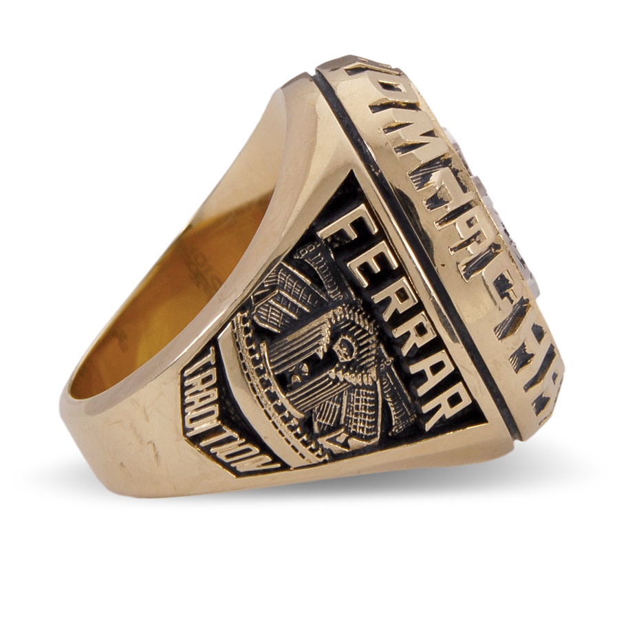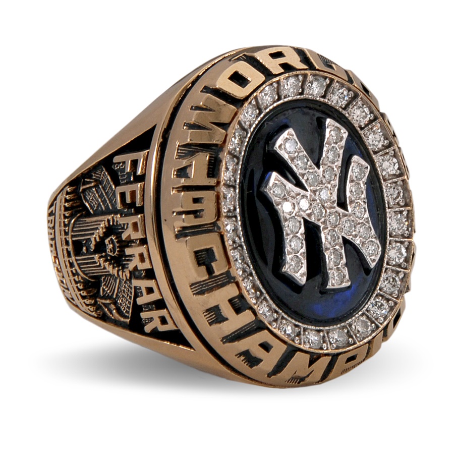 Joe Torre's 1998 Yankees were a juggernaut that breezed through the regular season with 114 wins and cruised through the postseason, culminating in a four-game sweep of the San Diego Padres to repeat as World Champions. This spectacular ring from that special season is in NRMT condition and belonged to an employee named Ferrar and features real diamonds on top comprising the NY logo on the blue stone background. The wording encircling the face reads: WORLD CHAMPIONS with 1998 split on the left and right sides. The left shank boasts the recipient's name and the word TRADITION with the championship trophy superimposed against Yankee Stadium in between. On the right shank is the team's record of 125-50 (counting an 11-2 postseason) and the words: BEST EVER surrounding the team logo. "Balfour 10K" is stamped inside, and it the ring is housed in the original Balfour box. What made the 1998 Yankees' gaudy record especially impressive was the fact that not one player hit 30 home runs (first baseman Tino Martinez led the club with 28 dingers and 123 RBI) and only one pitcher - David Cone - won as many as 20 games (he was 20-7). This is a shimmering tribute to a remarkable club that was a testament to perfect chemistry. Size 10.