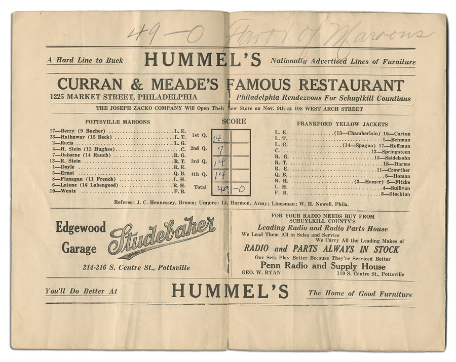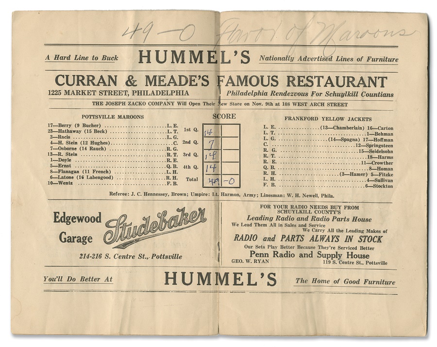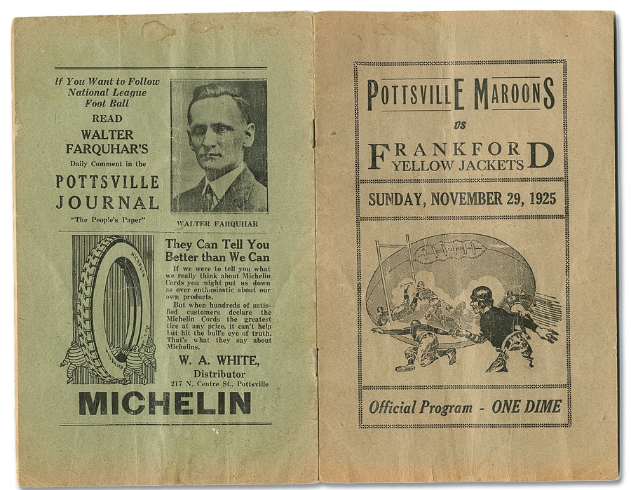 The 1925 Pottsville Maroons won the NFL title in their first year but had the designation stripped due to a postseason exhibition played against Notre Dame's Four Horsemen team (whom they beat, 9-7) that was prohibited by the league commissioner. This program from the season finale against the Frankford Yellow Jackets took place on Saturday, November 29 and, according to the cover, cost the grand total of a dime. This stunning piece of sports history has multiple creases but still displays nicely. The game is scored inside (the final is 49-0 "FAVOR OF MAROONS") and is in GD to VG condition overall. One of only a few 1925 Maroons programs known to exist, there's a roster inside, as well as some vintage advertisements and even "A THOUGHT FOR THE DAY" on the inside back cover.