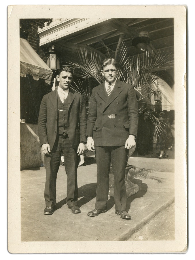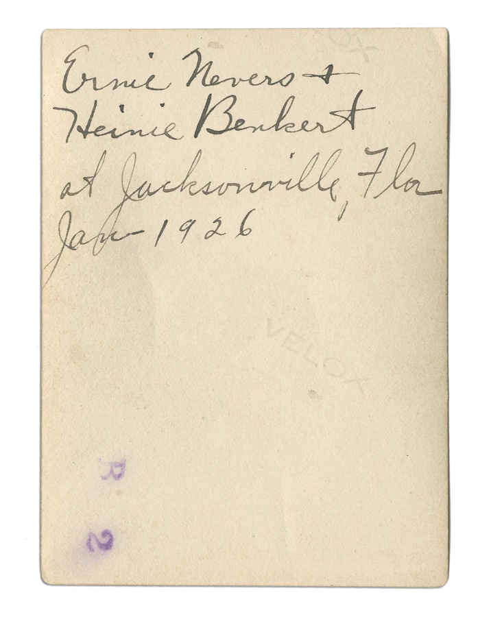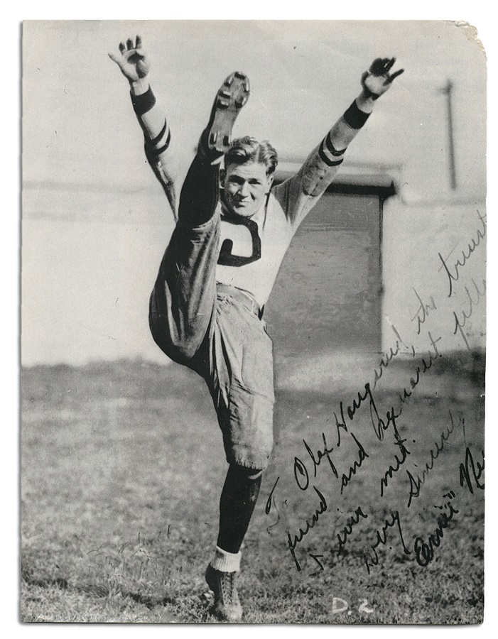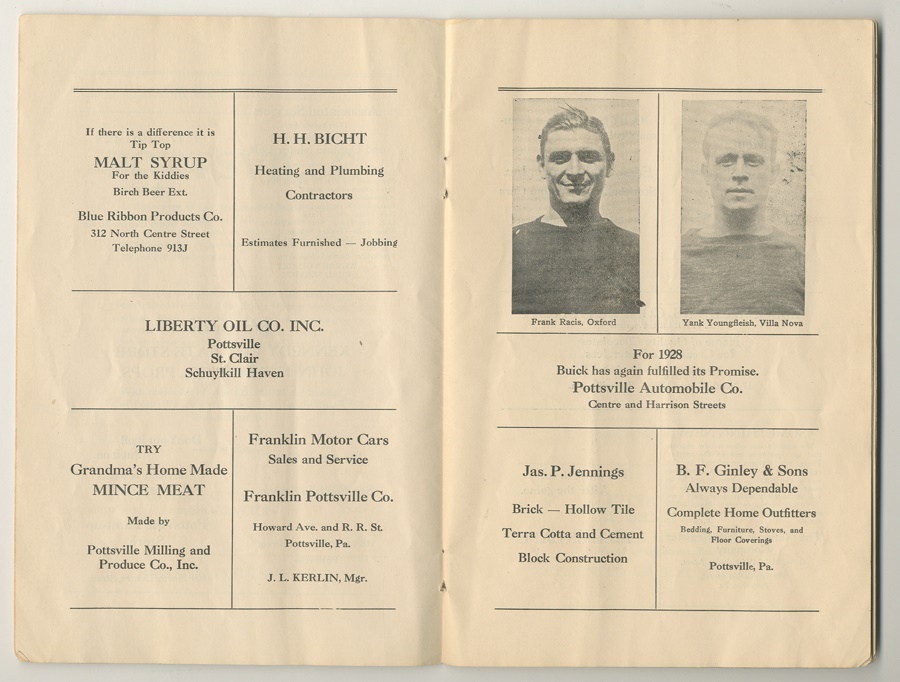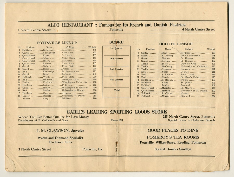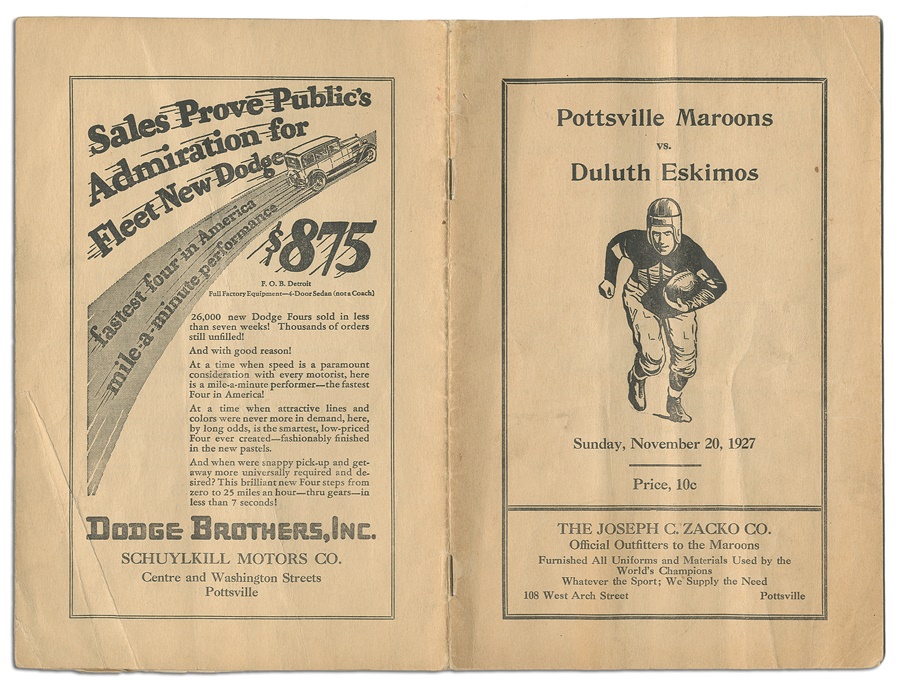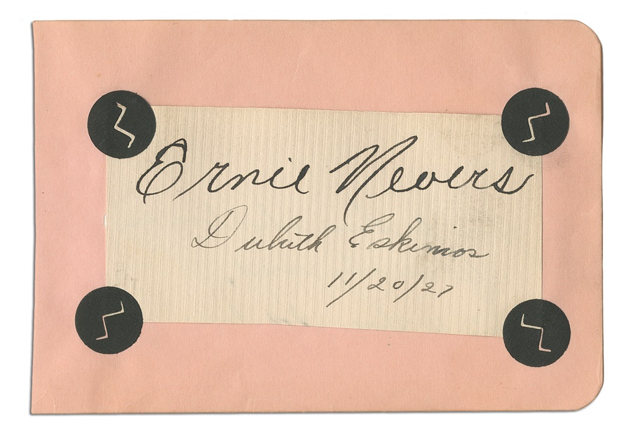 This very rare program from the short-lived Pottsville team features Ernie Nevers in the Duluth lineup. The lot comes with a signed album page of Nevers from the day of the game and includes an original snapshot of Nevers and a later print. It is dated 11/20/27 and the signature grades 9/10 in black fountain ink. The program has multiple creases and is in VG condition. Nevers - a college and pro football Hall of Famer - also played professional baseball with the St. Louis Browns. The Maroons played between 1925-29 before moving to Boston.