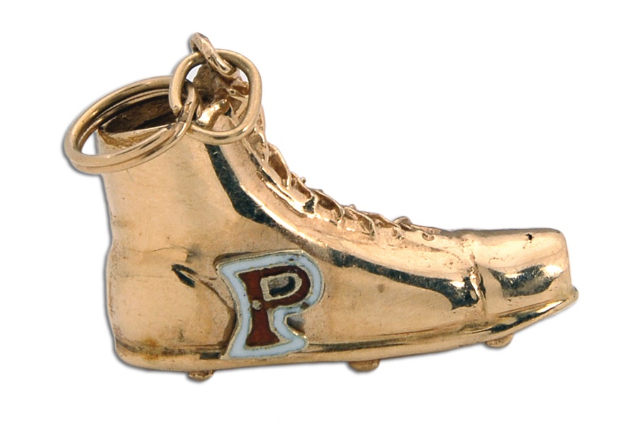 This gold shoe with enamel "P" was presented to living members of the NFL's Maroons... a team that existed for just four seasons (1925-28) but had its 1925 NFL championship vacated in a controversial decision by the commissioner at the time. The Maroons' official sporting goods outfitter Joseph Zacko waged a lifetime battle to have that title restored to the town of Pottsville, refusing to donate kicker Charlie Berry's bronzed shoe that kicked the winning field goal against Notre Dame to the Hall of Fame until the title was in fact restored. The shoe has become a symbol of tenacity and resiliency to the town's citizens.