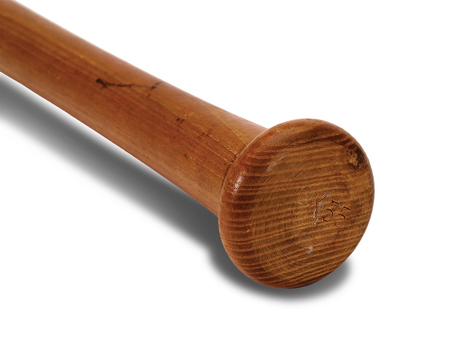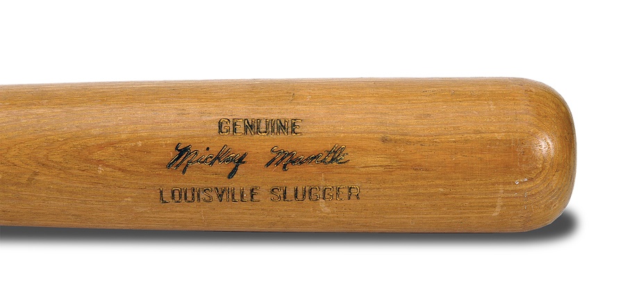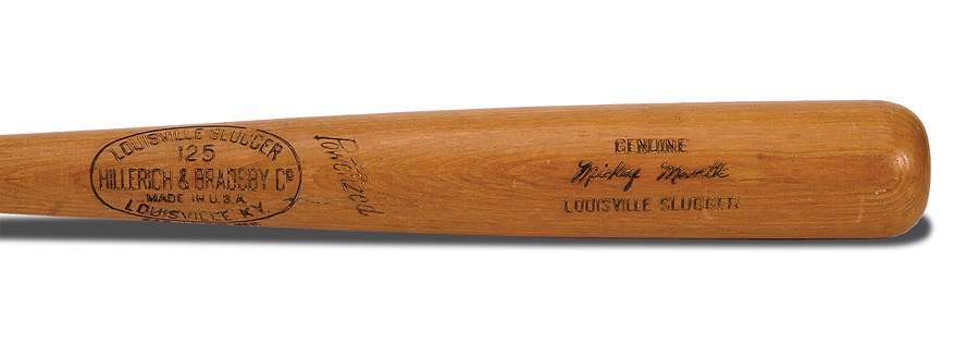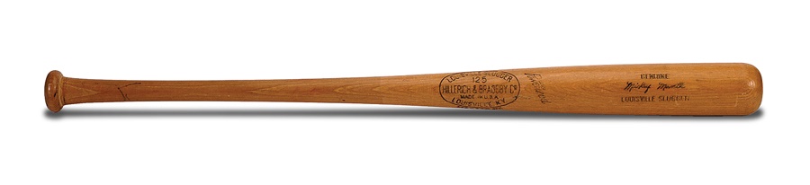 One of the most iconic American sports figures was Mickey Mantle, and this is one of the Hall of Fame outfielder's earliest bats, dating to 1953 based on a center brand variation. Hillerich and Bradsby Model K55 is 35 inches long and weighs 34 ounces. We call this a "game" bat instead of "game used" because although it exhibits some marks, it is uncracked and does not show what we determine to be definitive game use. When Mantle made his big-league debut in 1951, he possessed a rare combination of blazing speed and massive power, although his quickness was compromised after sustaining a freak injury in the outfield during his rookie season when his cleats got caught in an outfield drain. He was hampered by injuries from that point forward but still racked up phenomenal numbers and is widely regarded as the greatest switch-hitter the game has ever produced.