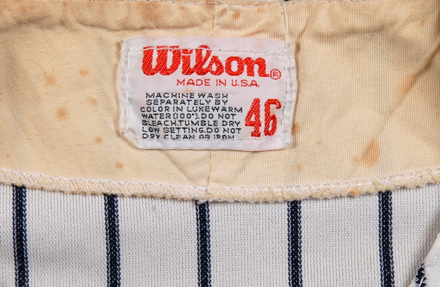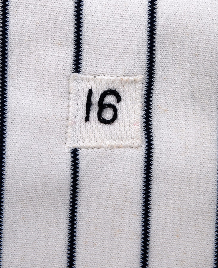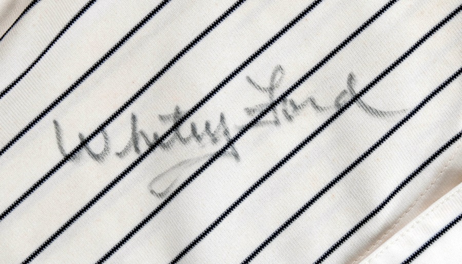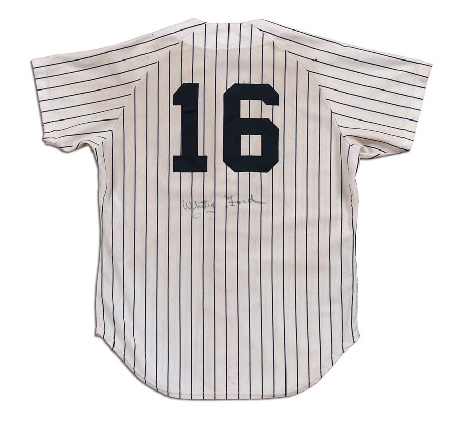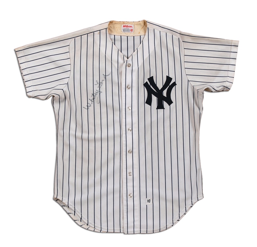 This all-original New York Yankees home jersey was worn by the immortal Whitey Ford during an early 1980s Old Timers function at Yankee Stadium. It is very possible that he wore this for more than one occasion. The collar tag show it as a Wilson, size 46, with a one-inch square patch with the number 16 sewn on the bottom left front. The design is the traditional Yankee pinstripes, with interlocking navy blue NY logo on the left breast and Ford's "16" on the back. Signed on the front and back in 6/10 black Sharpie. Shows very nice use, some discoloration inside the collar but overall this item is in very good condition.