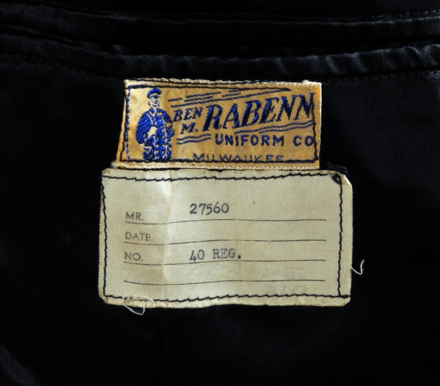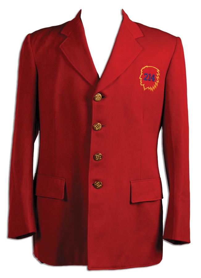Back when Hank Aaron was a young slugger and Warren Spahn was tossing shutouts with regularity, the Milwaukee Braves ushers at County Stadium sported snazzy red jackets such as this 42 Regular model. It bears an Indian profile patch on the left chest with the outlines stitched in yellow and the number “214” stitched in blue. The interior is lined with black satin and feature labels from Ben M. Rabenn on the inside breast and collar. Four gold-plated buttons adorn the front, each of which has a fancy raised "M." The jacket shows light wear and is a great throwback to a time when well-dressed ushers were conspicuous throughout major league stadiums.