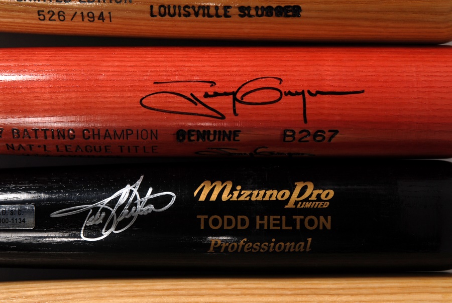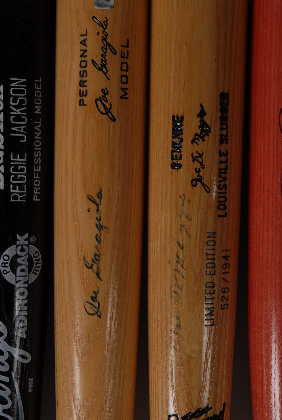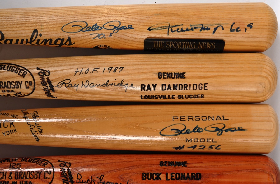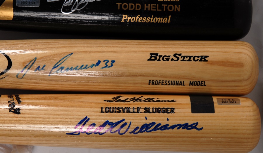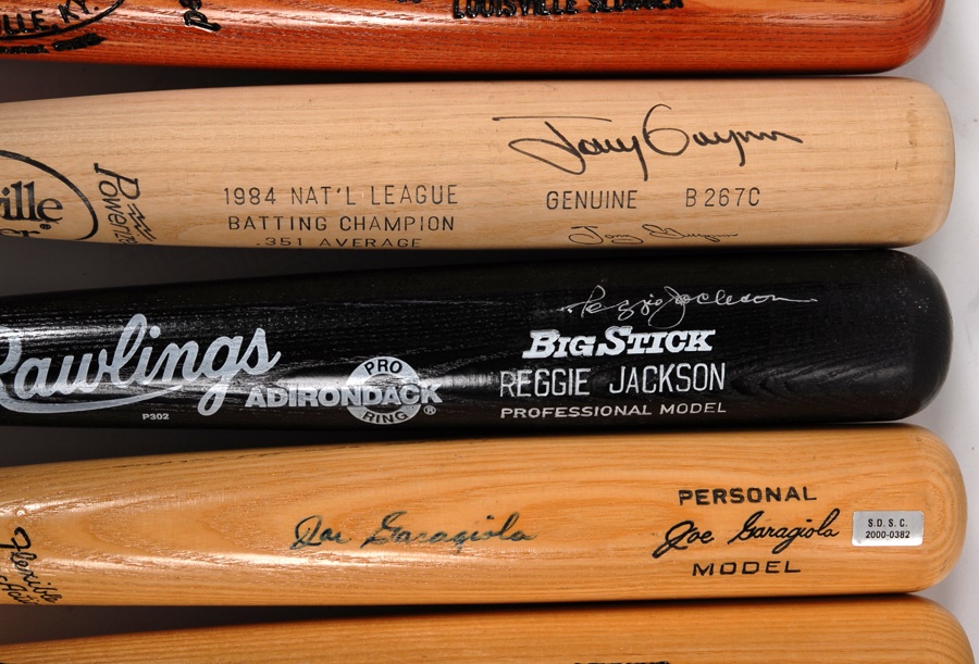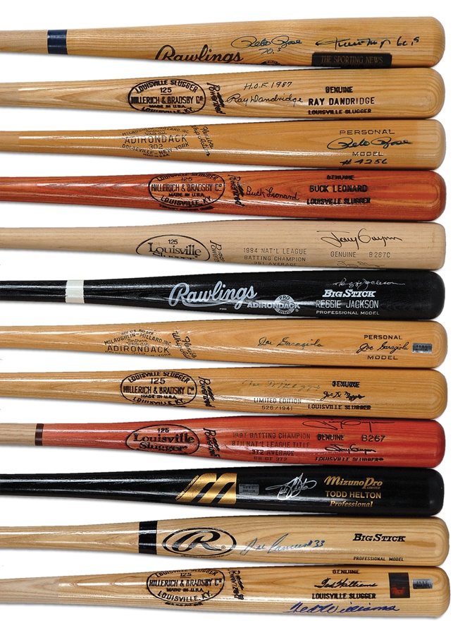 These 12 pieces of lumber are limited editions or show bats from superstar players and are mostly in NRMT condition. They bear the names of Reggie Jackson, Ted Williams, Todd Helton, Joe Garagiola, Joe DiMaggio, Jose Canseco, Ray Dandridge, Buck Leonard, Pete Rose, two Tony Gwynn models (from both his 1984 and 1997 batting champion seasons) and one bat signed by Rose, Willie Mays and Mike Schmidt. The bats are mostly NRMT, and the signatures average 8/10. The DiMaggio signature has faded to 5/10.